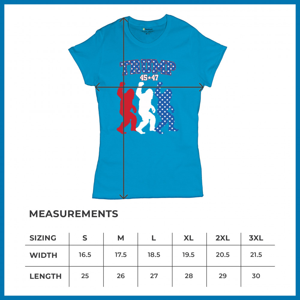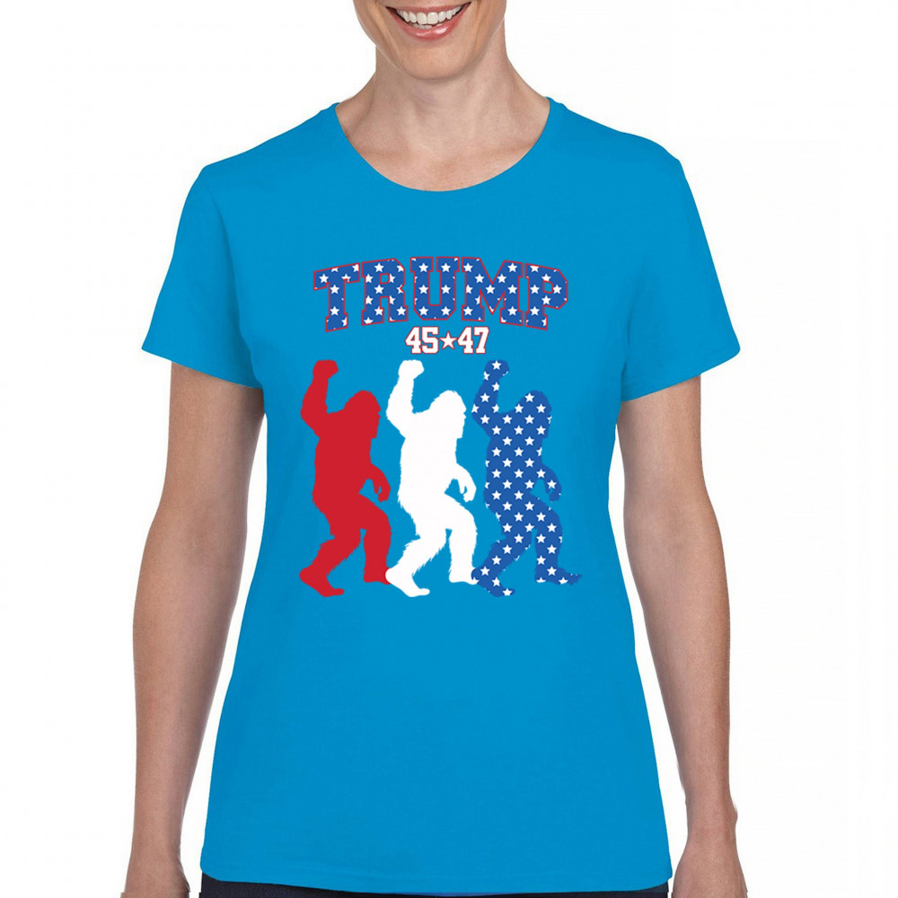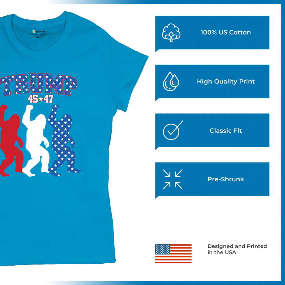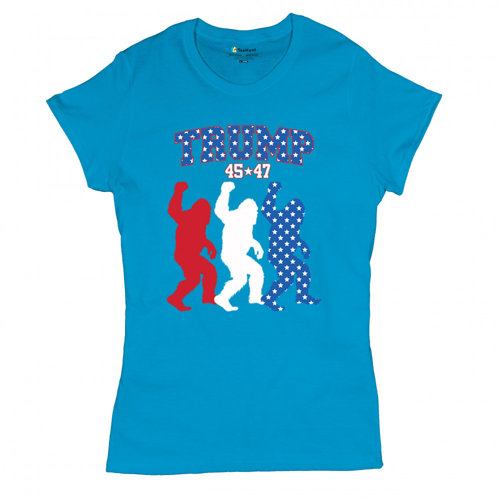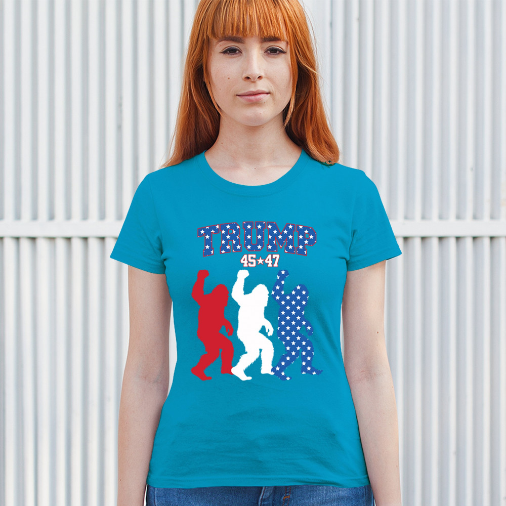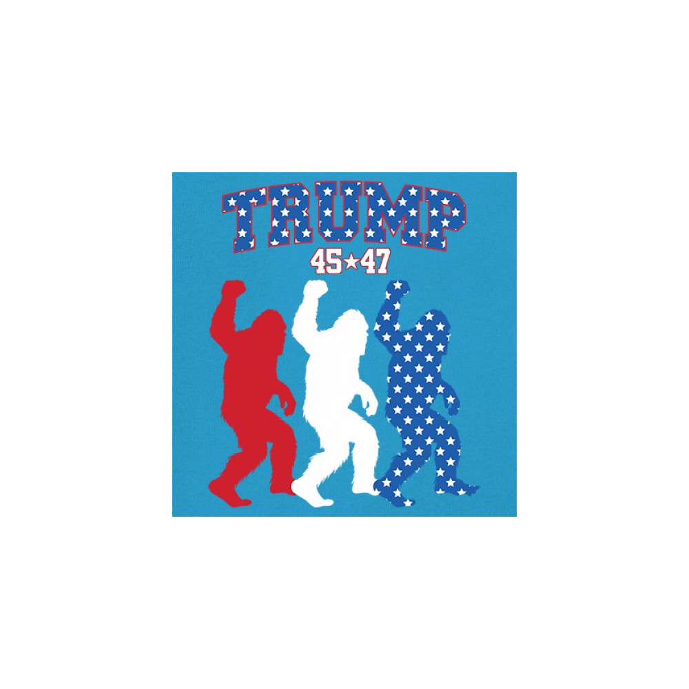 Trump 45/47 Bigfoot design in red, white, and blue with American flag stars. Celebrate patriotism, humor, and the fight for America First values.