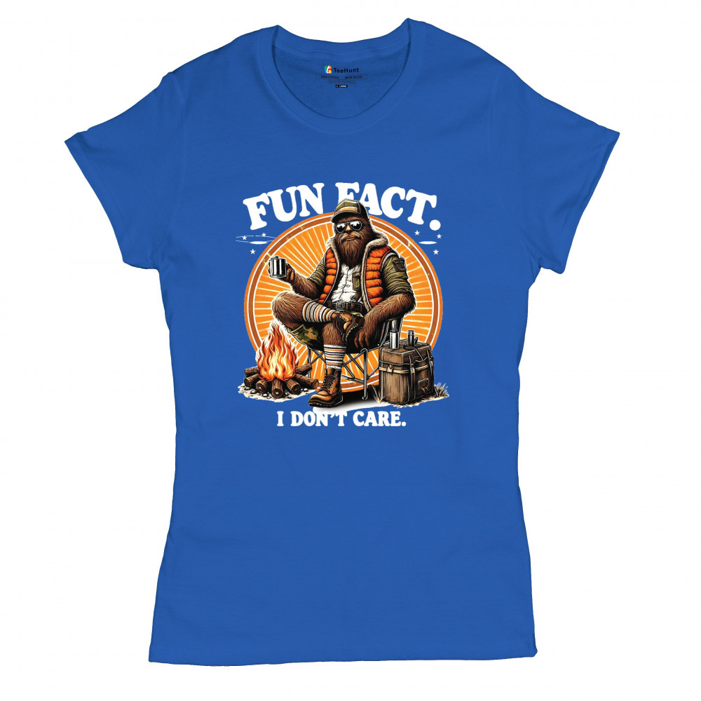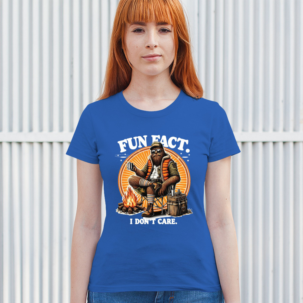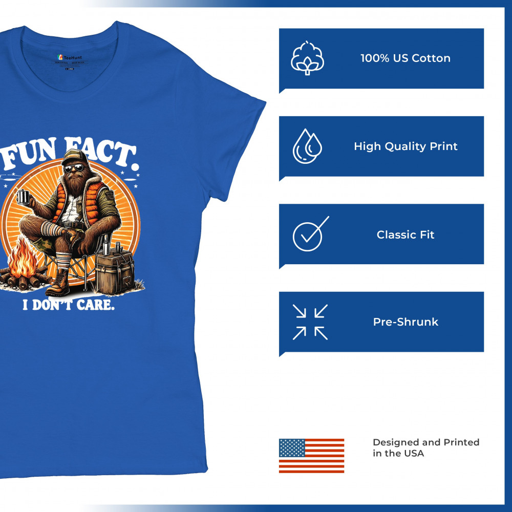Funny Bigfoot Fun Fact design with cryptid humor, sarcastic outdoors shirt vibe, retro Sasquatch saying, USA pride, and camping adventure style.