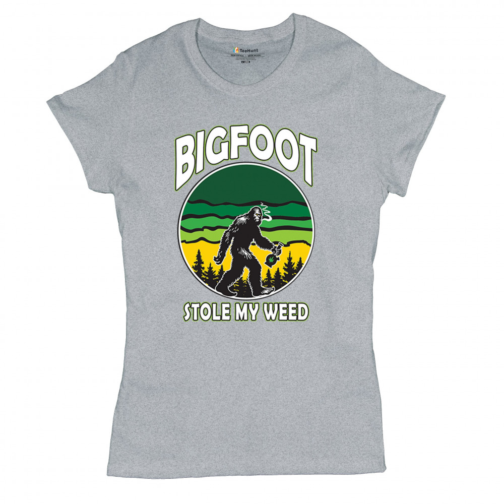 Humorous "Bigfoot Stole My Weed" design featuring Bigfoot and a cannabis leaf. Perfect for fans of Mary Jane, stoned humor, and a chill lifestyle.