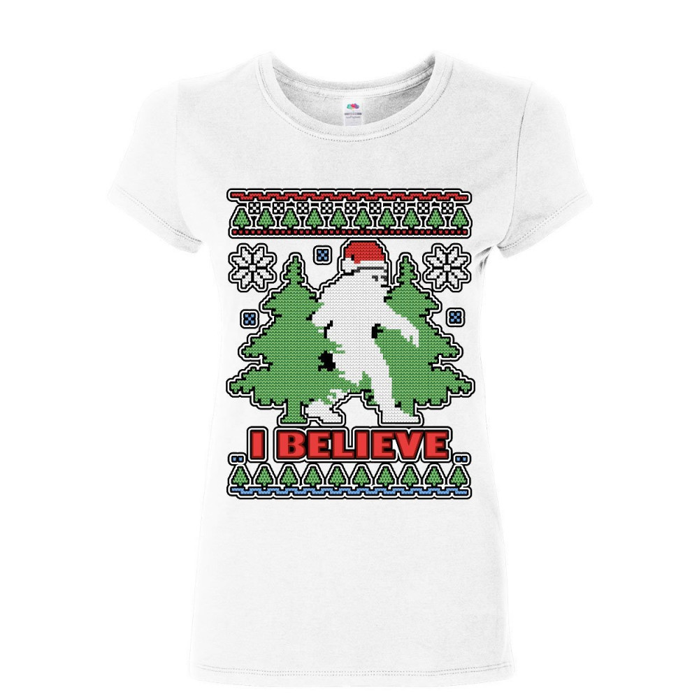 I BELIEVE bigfoot ugly sweatshirt women's t-shirt funny christmas yeti shirt white
