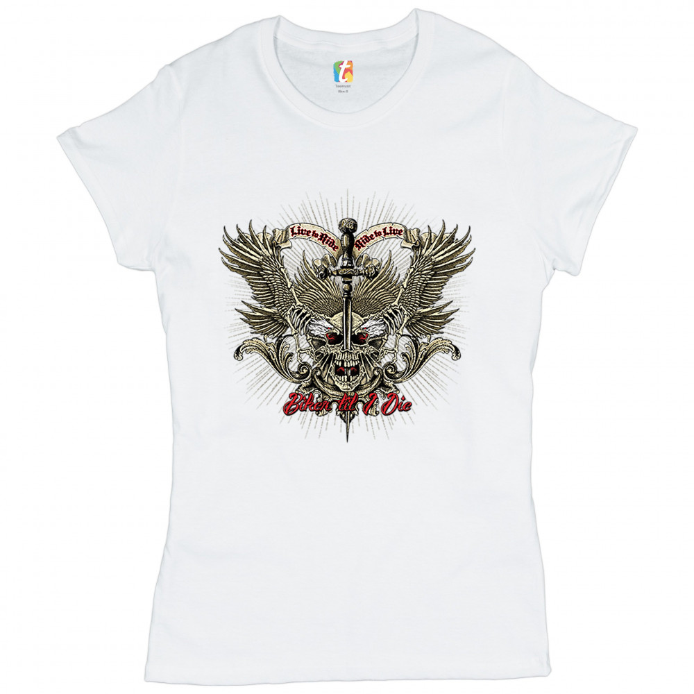 BIKER TIL I DIE t-shirt live to ride biker forever skull face women's tee white
