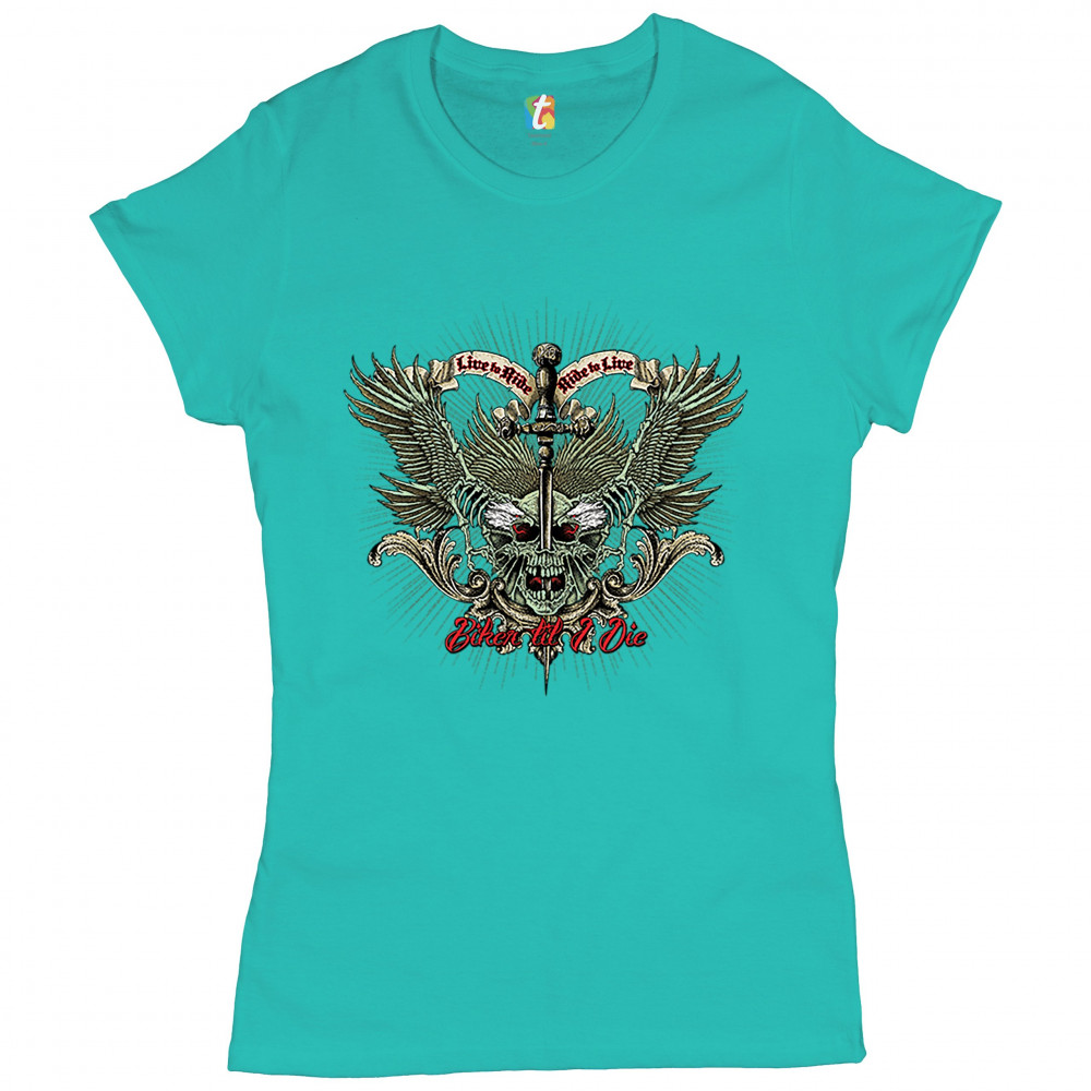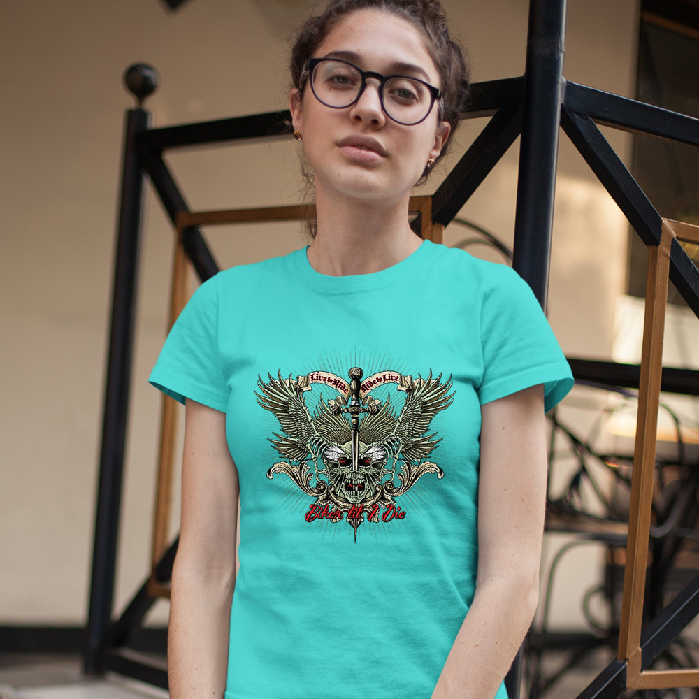 BIKER TIL I DIE t-shirt live to ride biker forever skull face women's tee light blue
