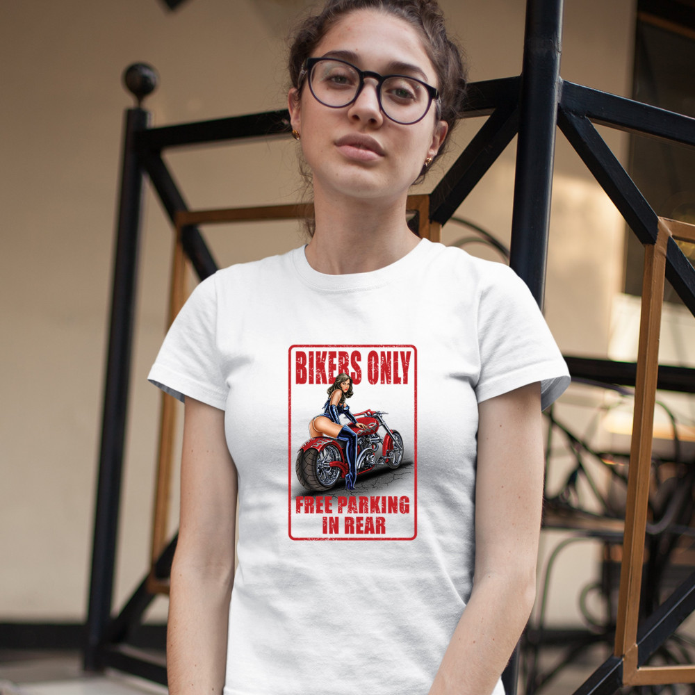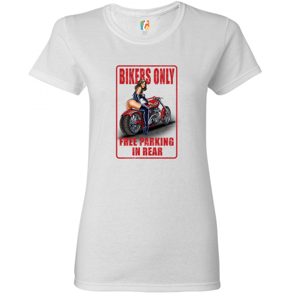 BIKERS ONLY FREE PARKING IN REAR t-shirt funny pin-up biker chick women's tee white