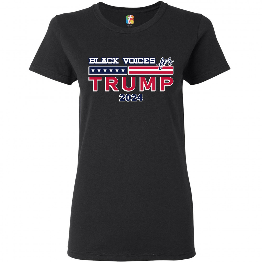 BLACK VOICES FOR TRUMP t-shirt donald trump 2024 stars and stripes women's tee black