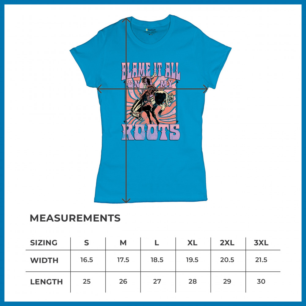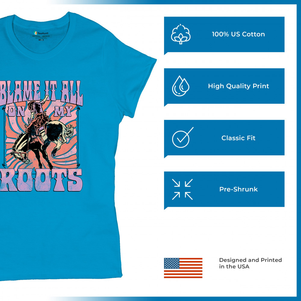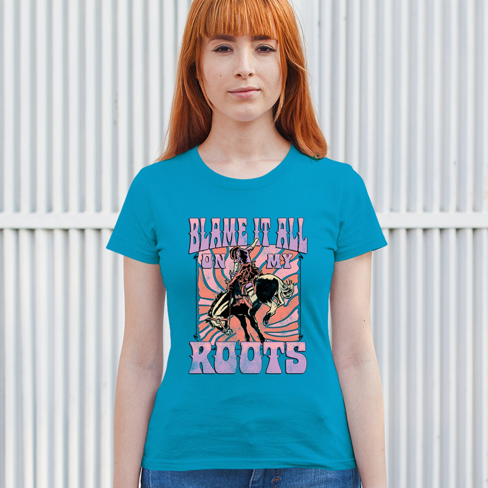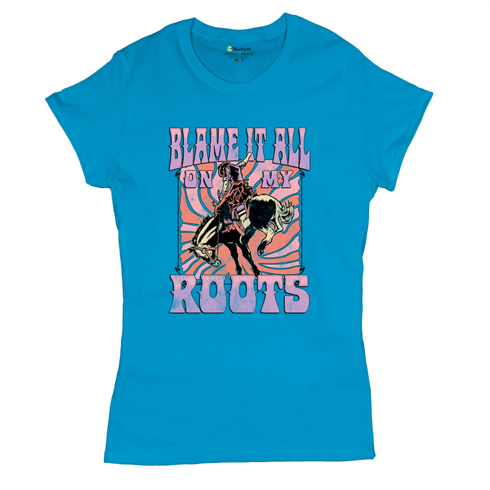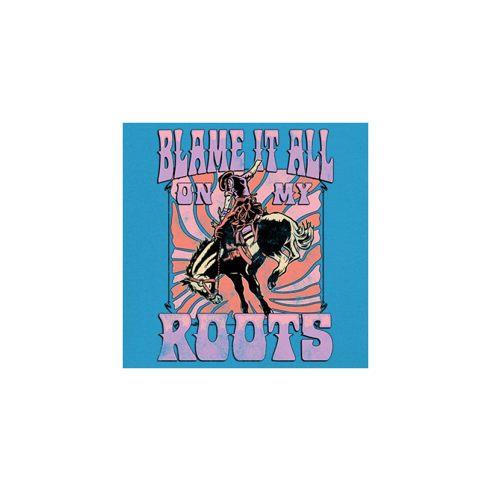Blame It All On My Roots is vintage country style with rodeo spirit, perfect for small town life, barn dances, and wild country pride.