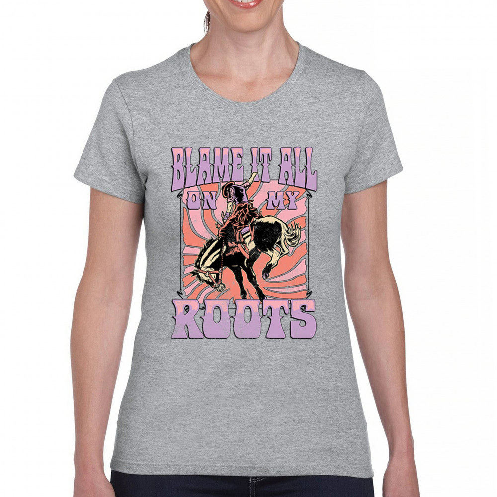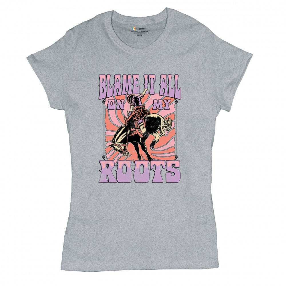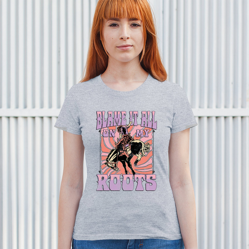 Blame It All On My Roots is vintage country style with rodeo spirit, perfect for small town life, barn dances, and wild country pride.