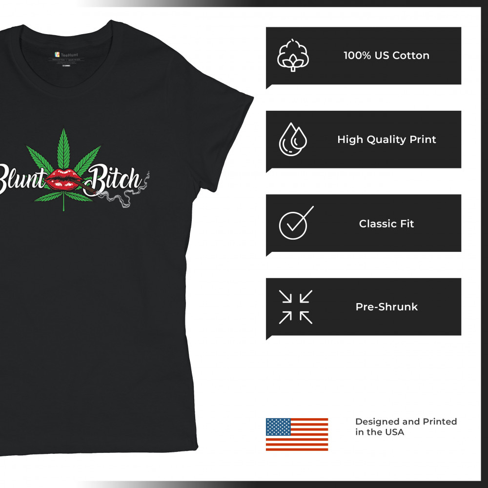 Fierce “Blunt Bitch” design with red lips, blunt, and weed leaf. Bold 420 fashion for confident stoners, cannabis queens, and loud personalities.