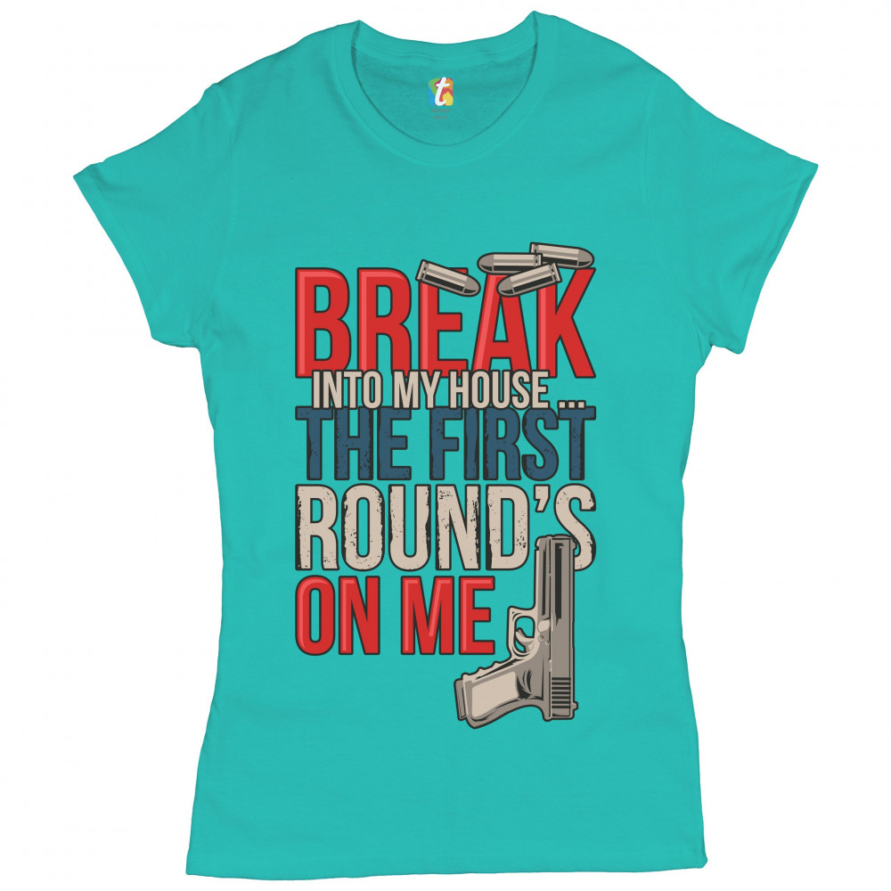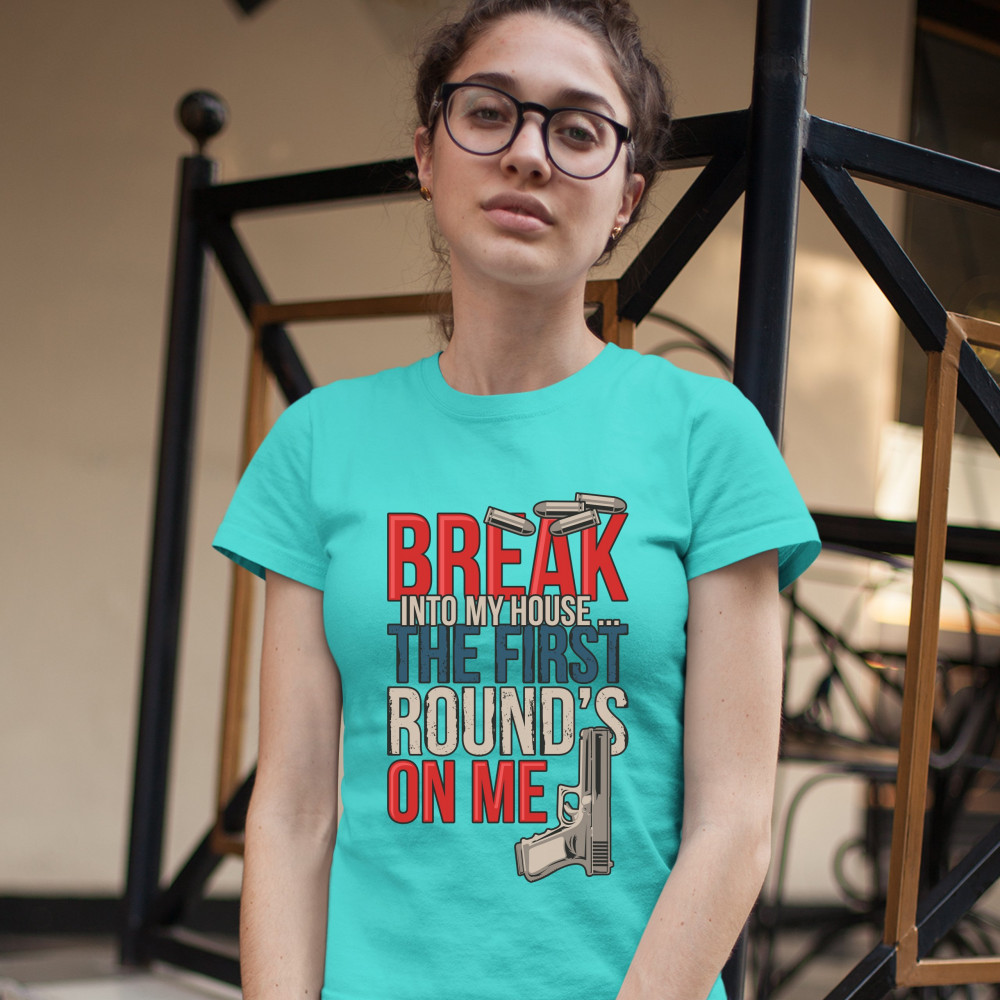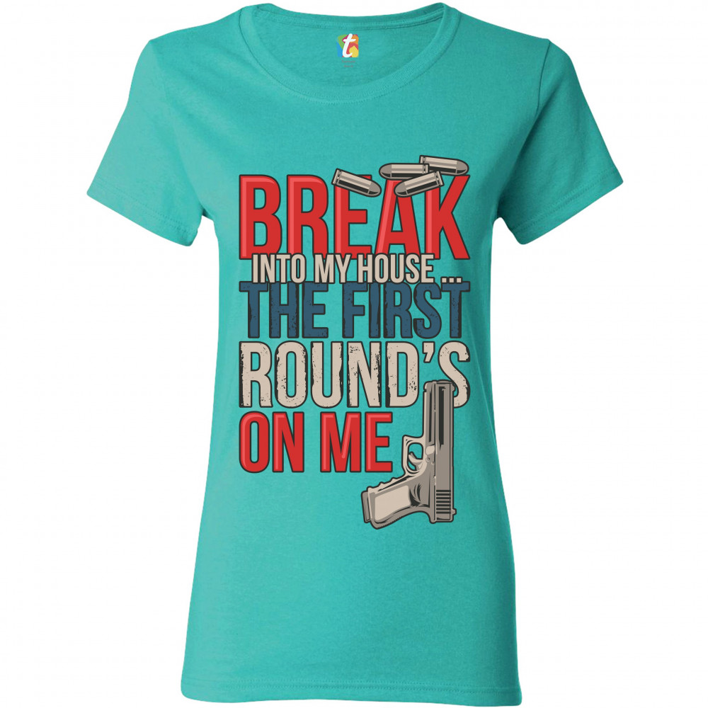 BREAK INTO MY HOUSE.. THE FIRST ROUND'S ON ME t-shirt 2nd amendment women's tee light blue