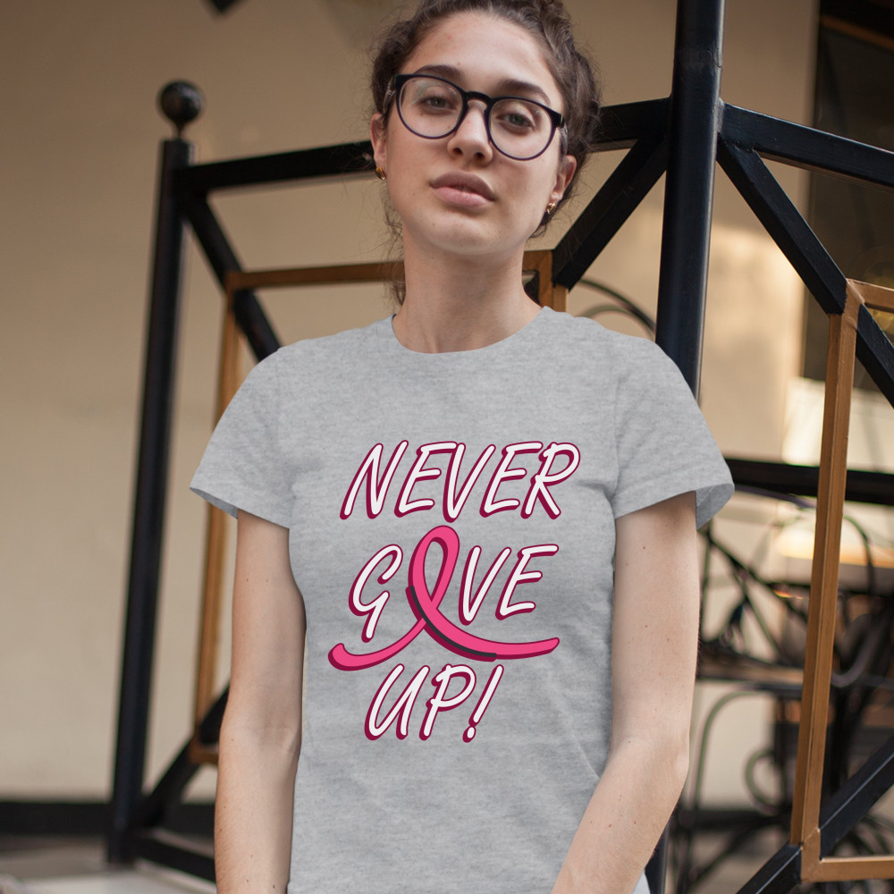 BREAST CANCER AWARENESS NEVER GIVE UP t-shrit pink ribbon women's tee gray