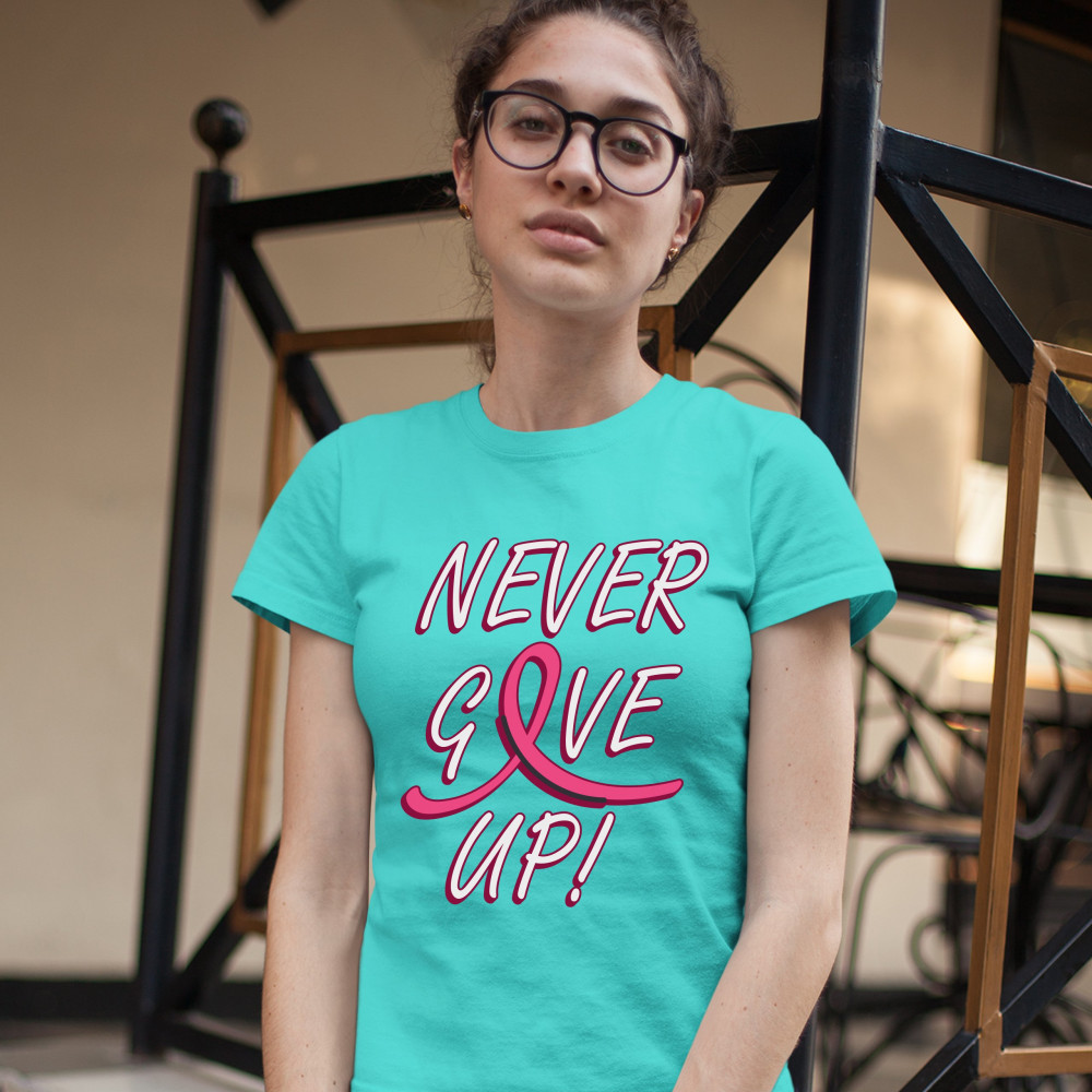 BREAST CANCER AWARENESS NEVER GIVE UP t-shrit pink ribbon women's tee light blue