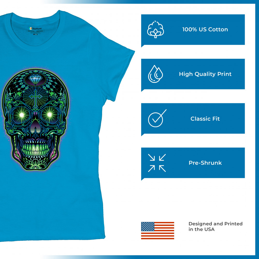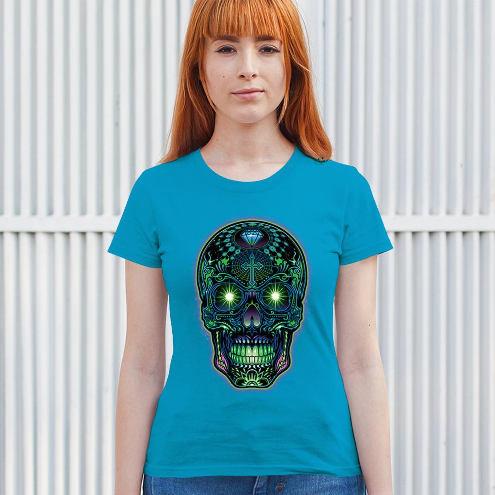 Electrified sugar skull with glowing green eyes, neon cross and diamond, perfect for rave lovers, skull art fans, and Day of the Dead style.