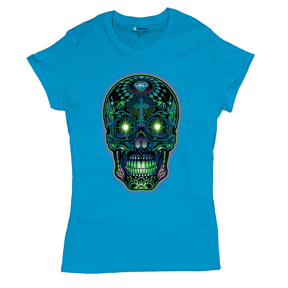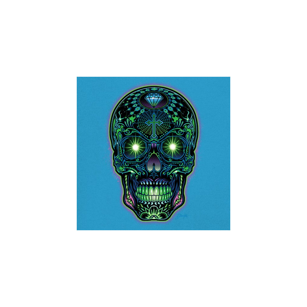 This electrified sugar skull design glows with neon energy and intricate details. Featuring green eyes, radiant cross, diamond, spider web, and vivid colors, it's a bold mash-up of psychedelic art, Day of the Dead tradition, and rave culture. A vibrant design perfect for skull fans and spiritual rebels alike.
