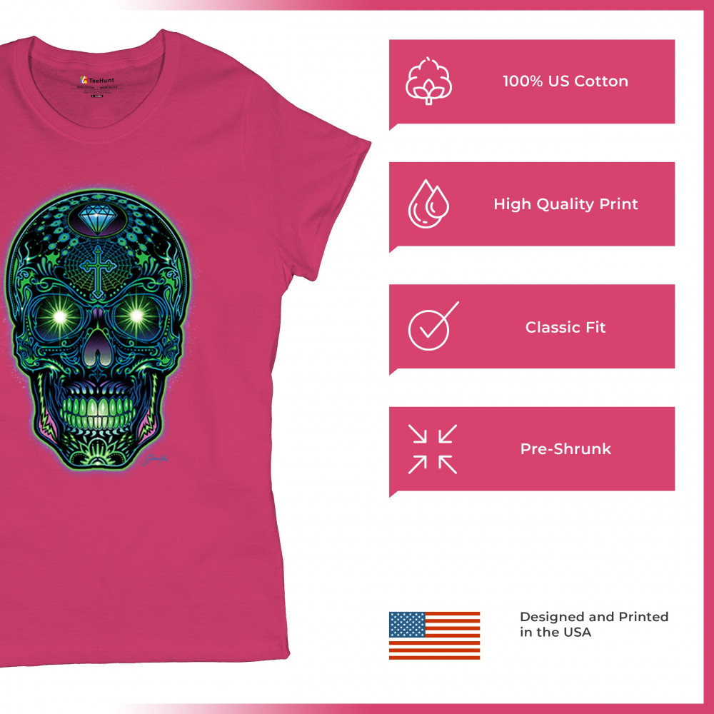 Electrified sugar skull with glowing green eyes, neon cross and diamond, perfect for rave lovers, skull art fans, and Day of the Dead style.