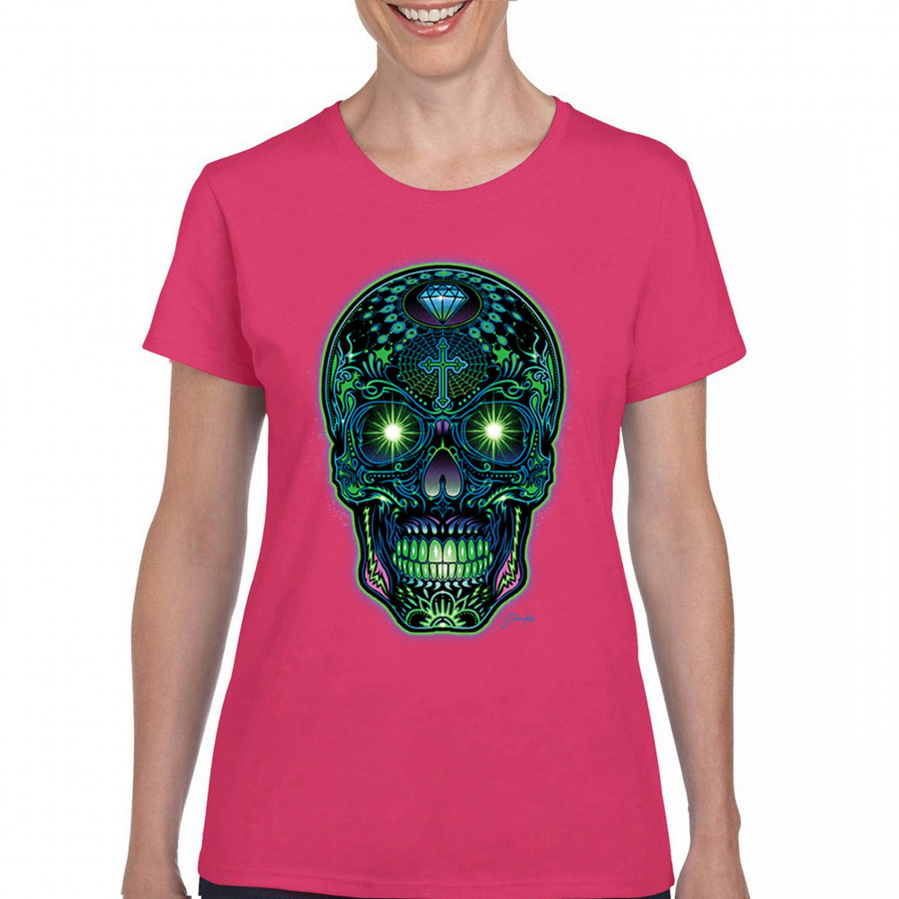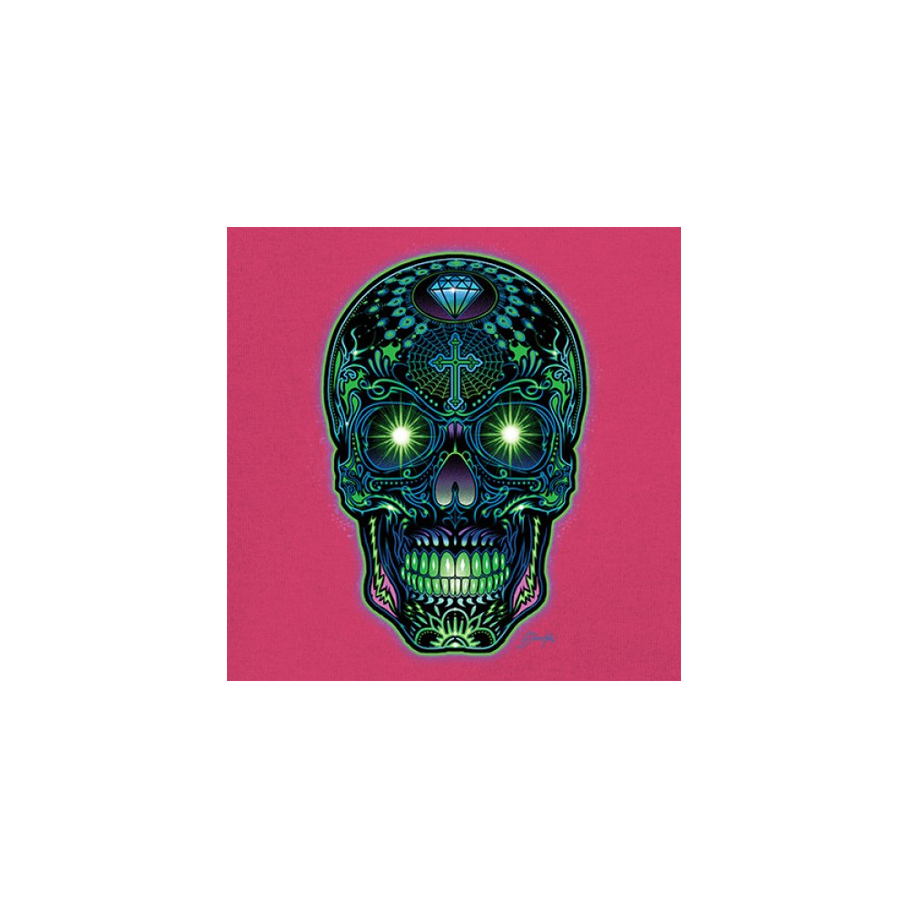 This electrified sugar skull design glows with neon energy and intricate details. Featuring green eyes, radiant cross, diamond, spider web, and vivid colors, it's a bold mash-up of psychedelic art, Day of the Dead tradition, and rave culture. A vibrant design perfect for skull fans and spiritual rebels alike.