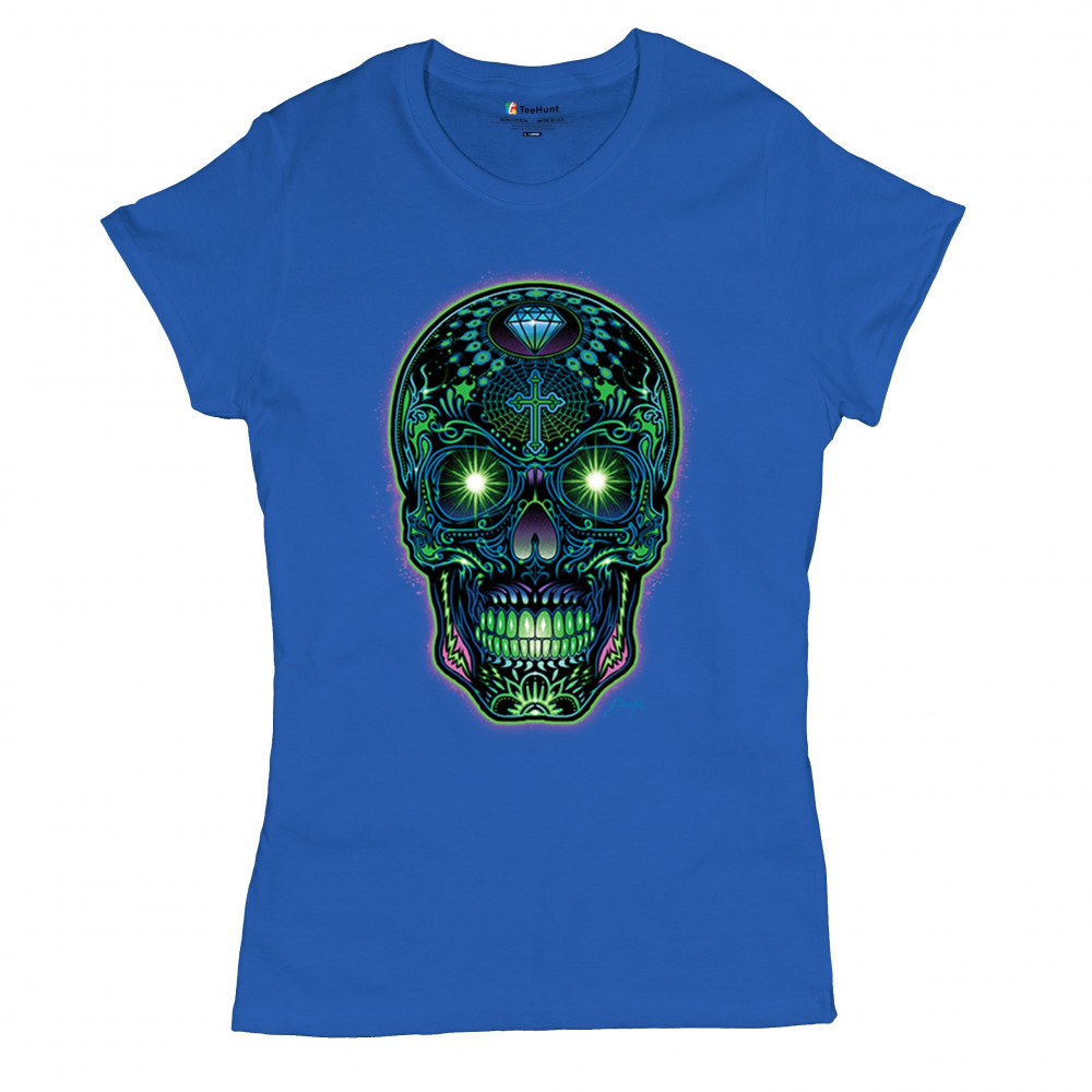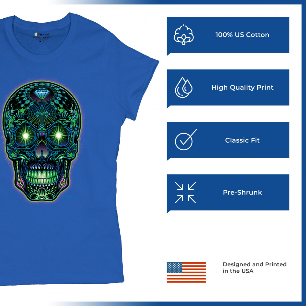Electrified sugar skull with glowing green eyes, neon cross and diamond, perfect for rave lovers, skull art fans, and Day of the Dead style.