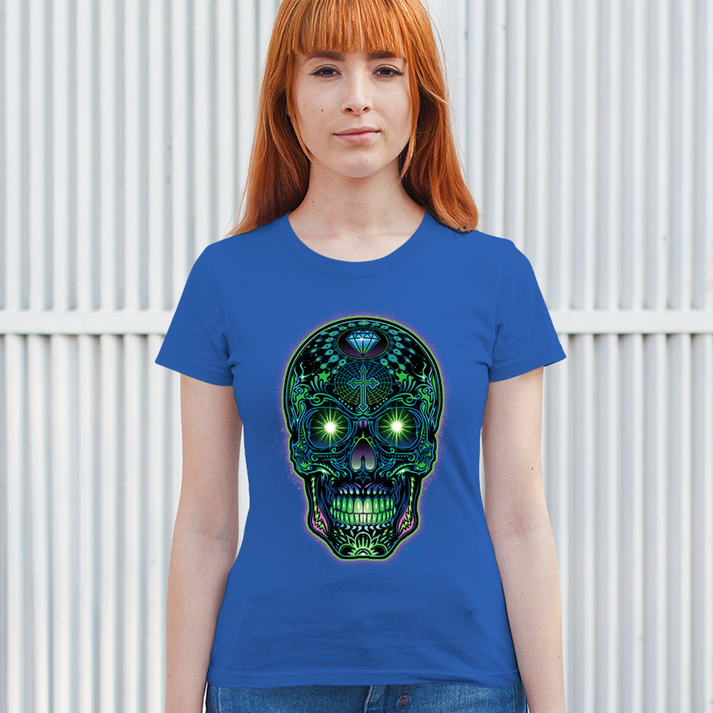 This electrified sugar skull design glows with neon energy and intricate details. Featuring green eyes, radiant cross, diamond, spider web, and vivid colors, it's a bold mash-up of psychedelic art, Day of the Dead tradition, and rave culture. A vibrant design perfect for skull fans and spiritual rebels alike.