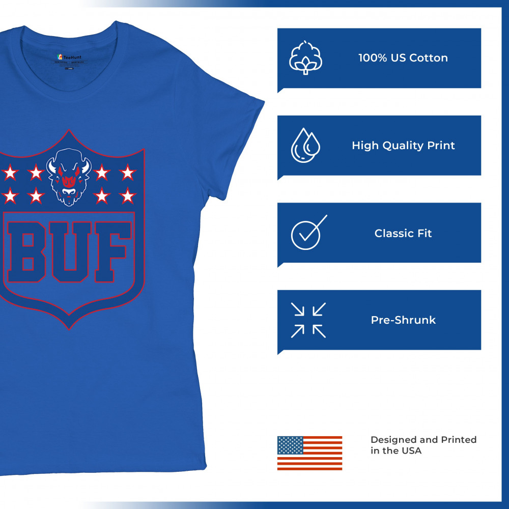 Bold Buffalo bison shield design for game day gear, tailgating, Sunday football, and championship pride in The Queen City.