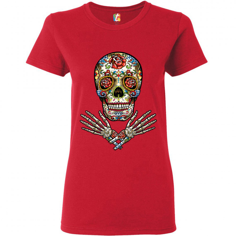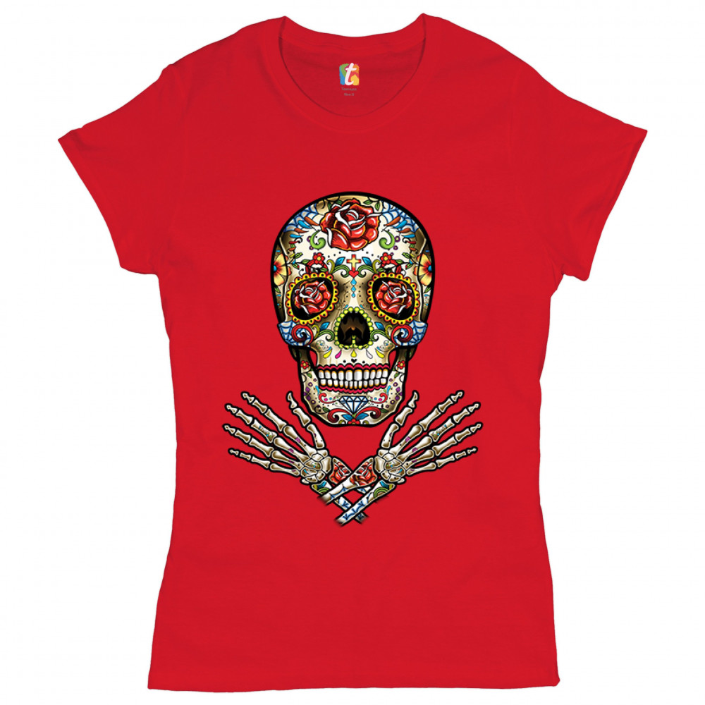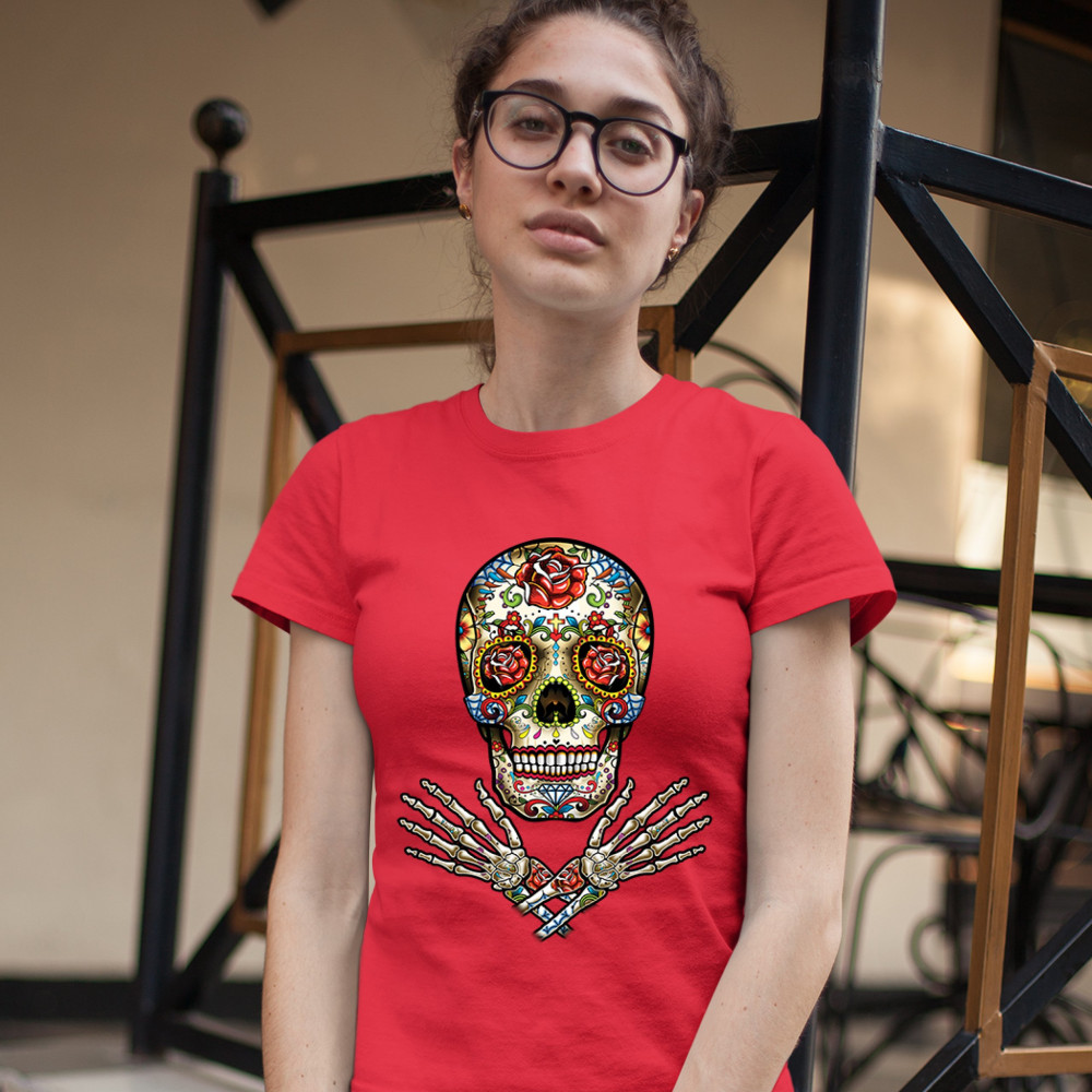 A huge print featuring a big calavera with roses in the eye sockets. There is a cross between the eyes and a huge rose on the forehead. Below the skull there are crossed arms. A great choice for anyone who upholds the traditions and celebrates the Day of
