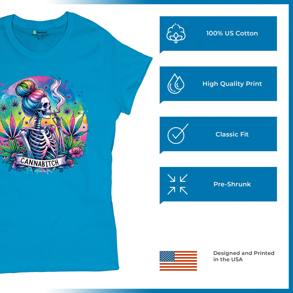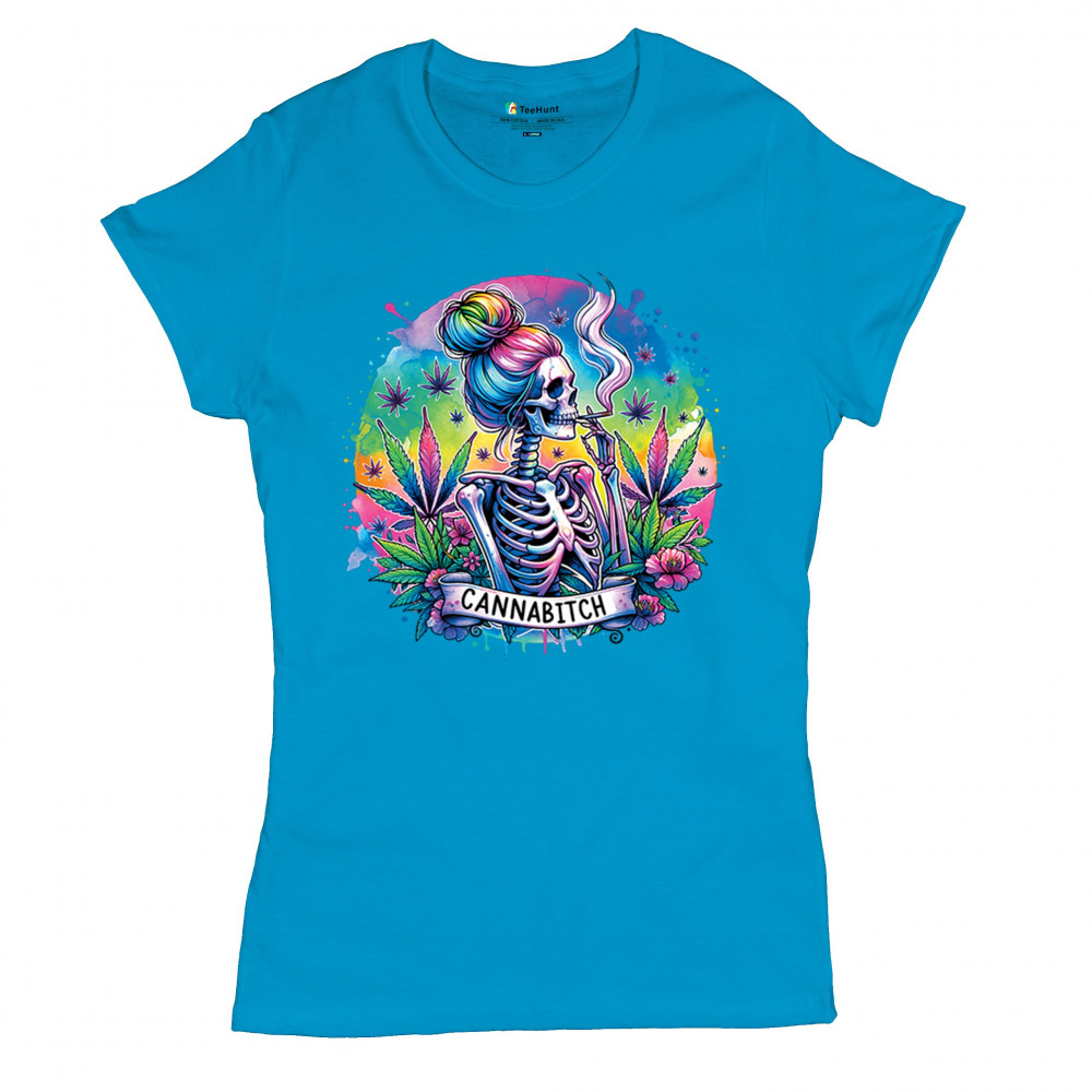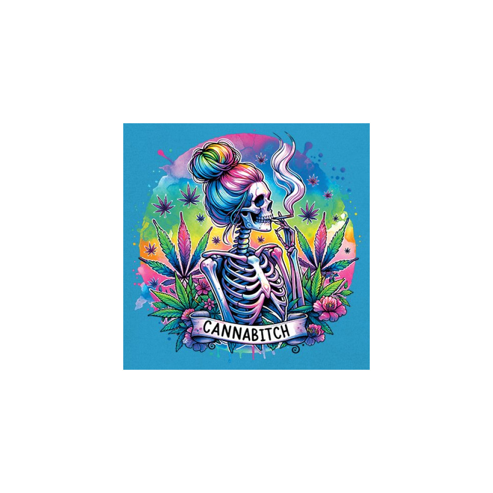 Unleash your inner weed queen with this CANNABITCH design—a psychedelic rainbow skeleton with major stoner girl energy. Dripping in neon colors, bold bud leaves, and fierce feminine vibes, it's a head-turning graphic for cannabis culture lovers, party girls, and unapologetically high women.