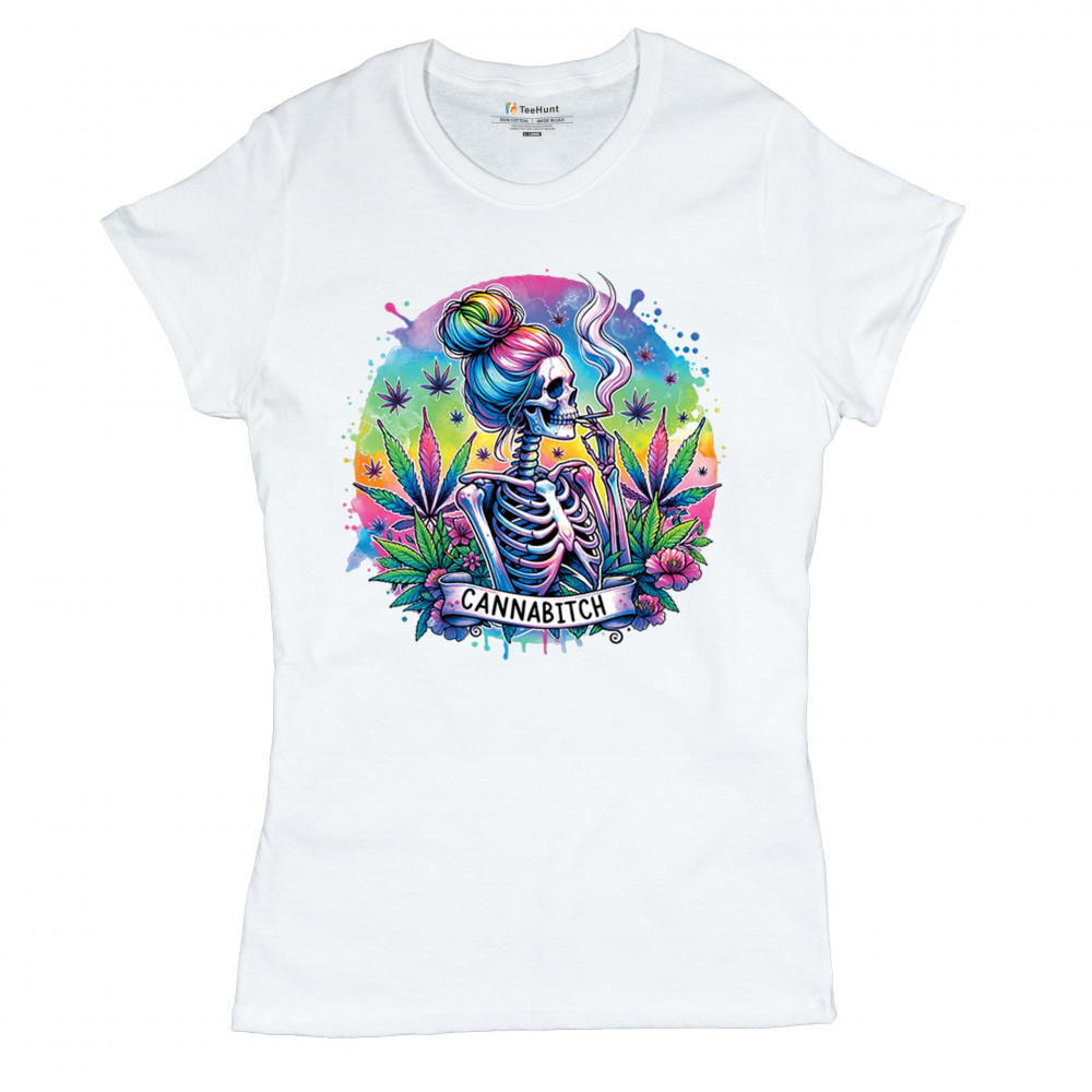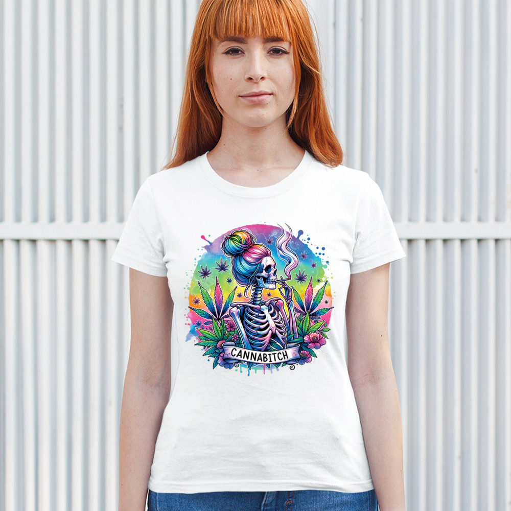 Unleash your inner weed queen with this CANNABITCH design—a psychedelic rainbow skeleton with major stoner girl energy. Dripping in neon colors, bold bud leaves, and fierce feminine vibes, it's a head-turning graphic for cannabis culture lovers, party girls, and unapologetically high women.