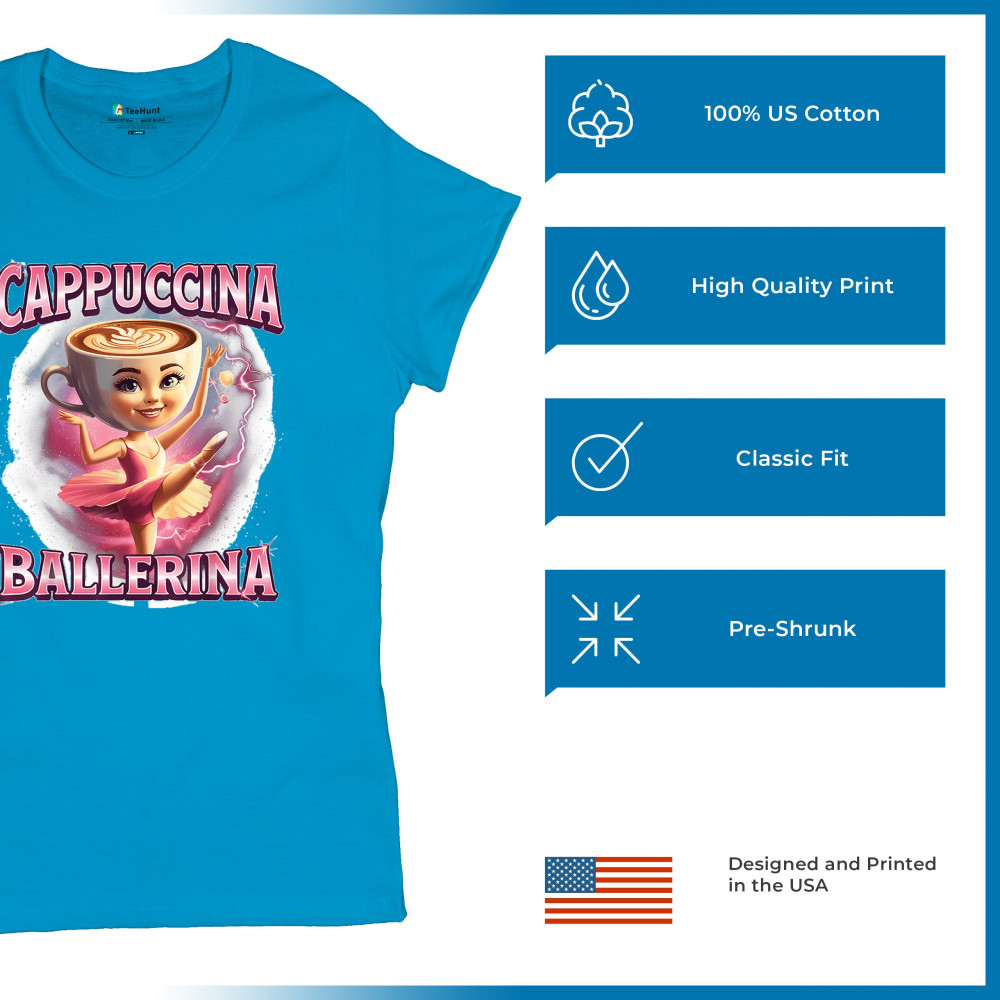 Cappuccina Ballerina is your perfect mix of meme chaos and coffee-core fashion. This absurd design features a ballet-dancing cappuccino head with weirdcore flair and Gen Z humor. A surreal blend of ironic internet fashion, TikTok trends, and espresso madness—ideal for meme lovers, caffeine addicts, and viral absurdists alike.