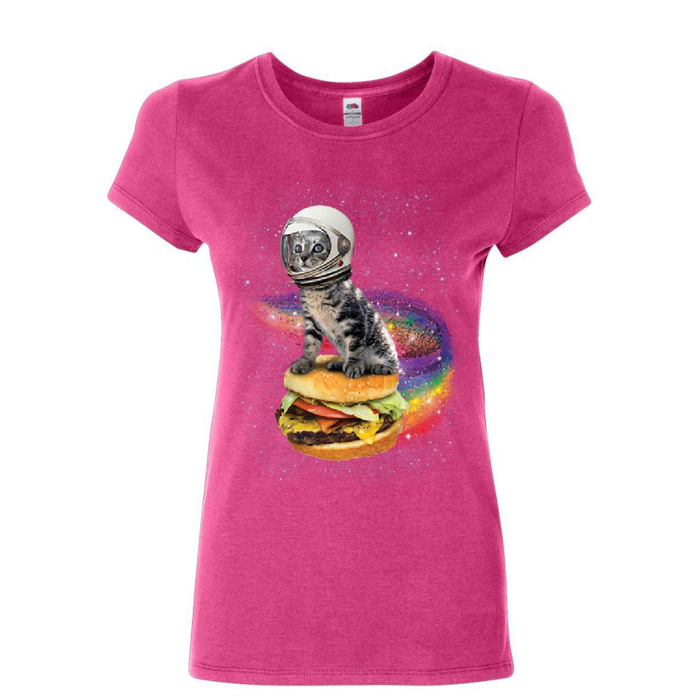 CAT FLYING A RAINBOW BURGER women's t-shirt funny astronaut kitten space shirt pink