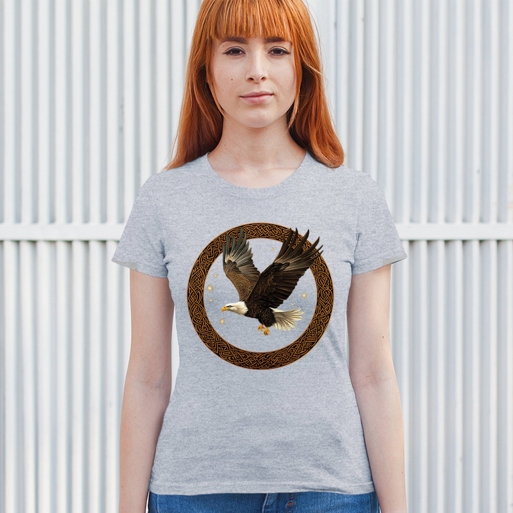 This powerful bald eagle takes flight within a Celtic knotwork circle, radiating strength, independence, and cosmic energy. The glowing stars and celestial background add mystic symbolism, blending nature, tribal design, and spirituality. Perfect for patriots, spiritual seekers, and bird enthusiasts.