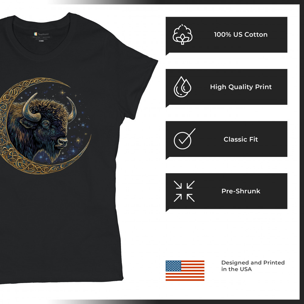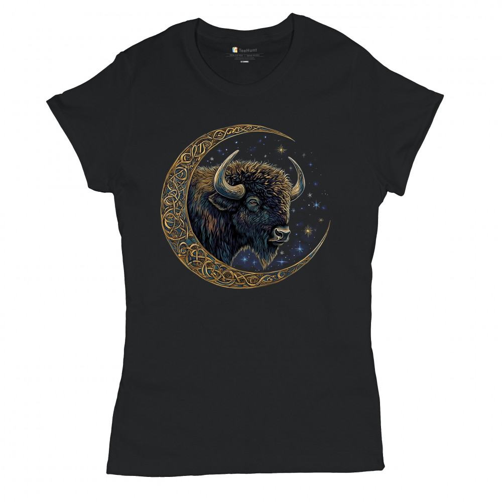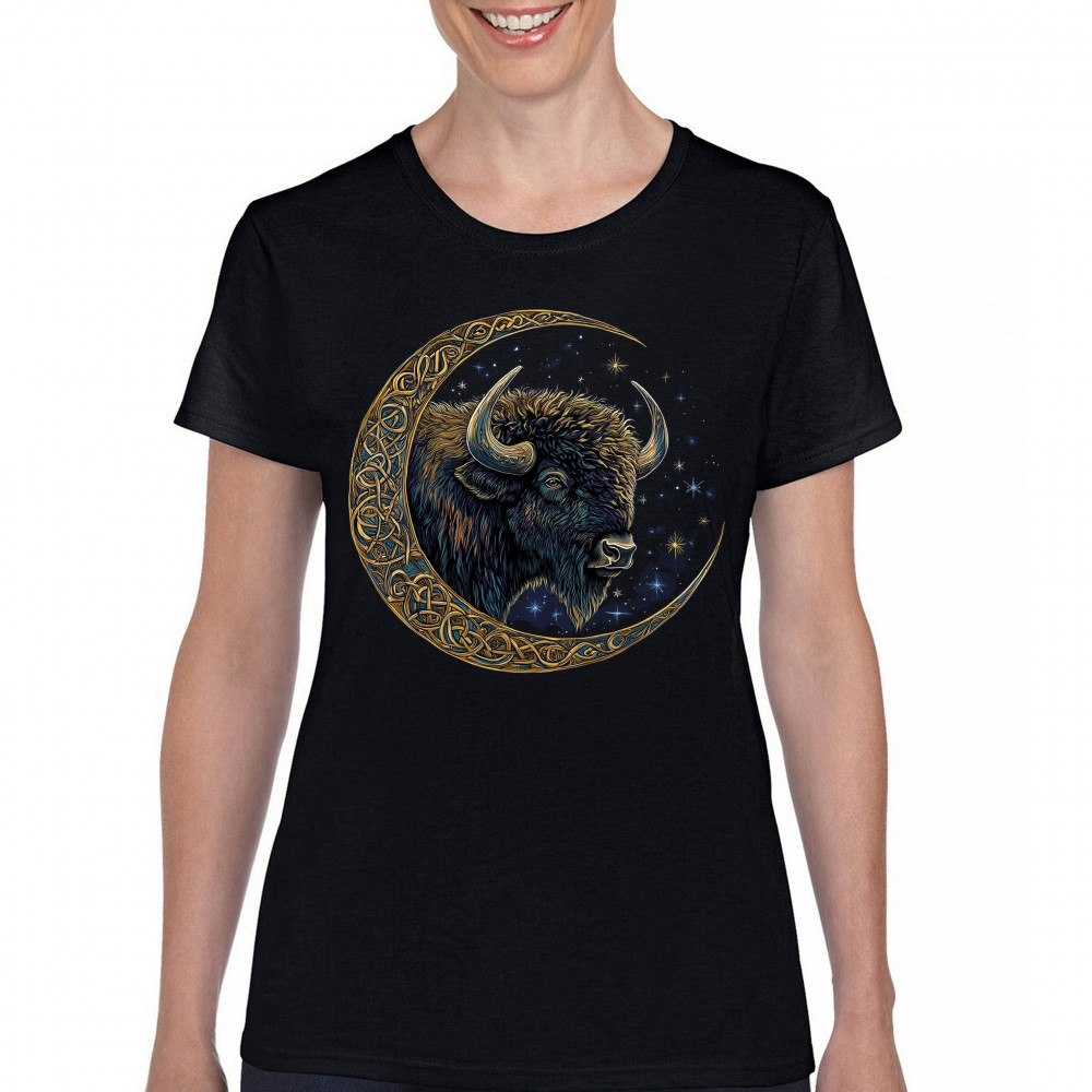 CELTIC MOON BISON t-shirt mystical forest animal wildlife celestial women's tee black