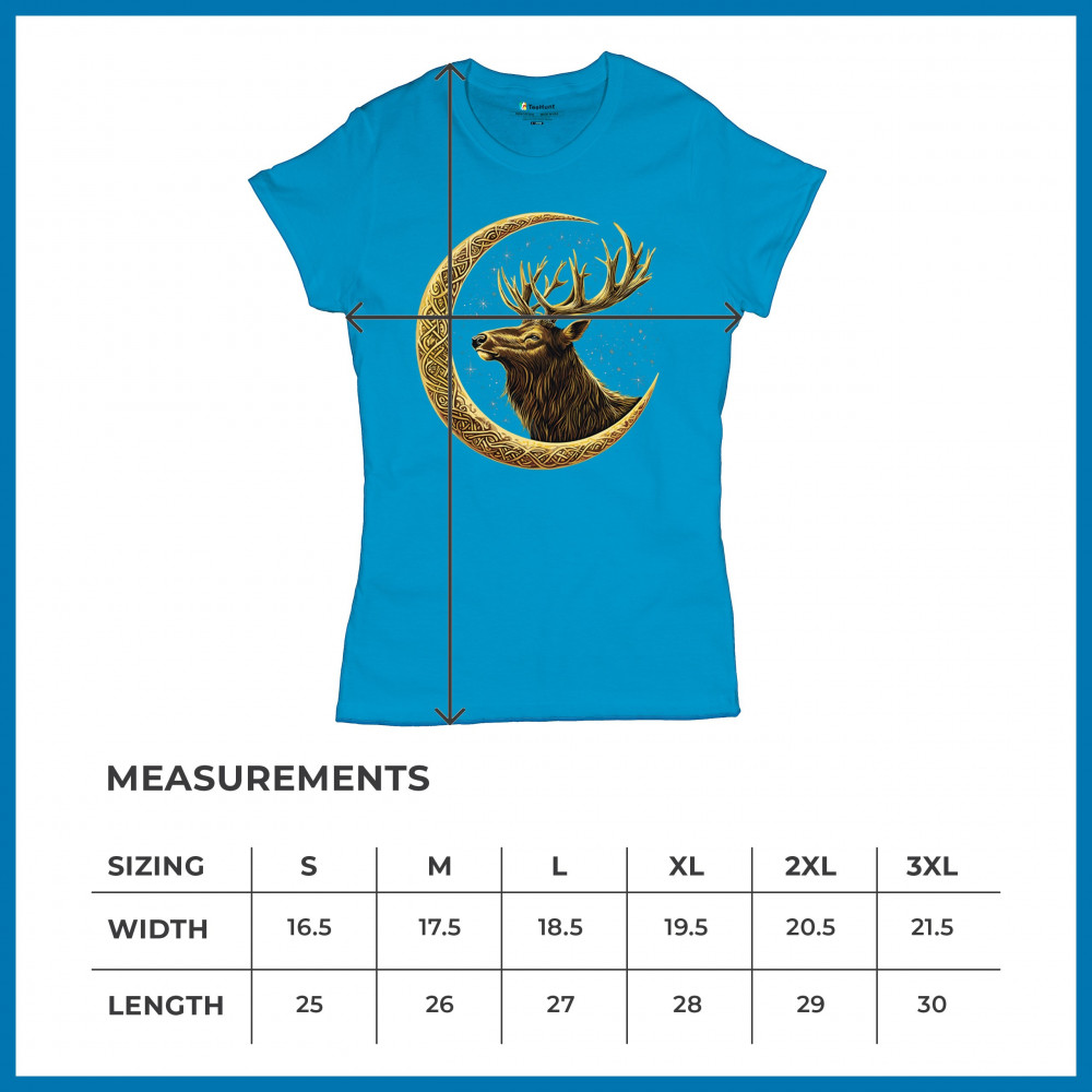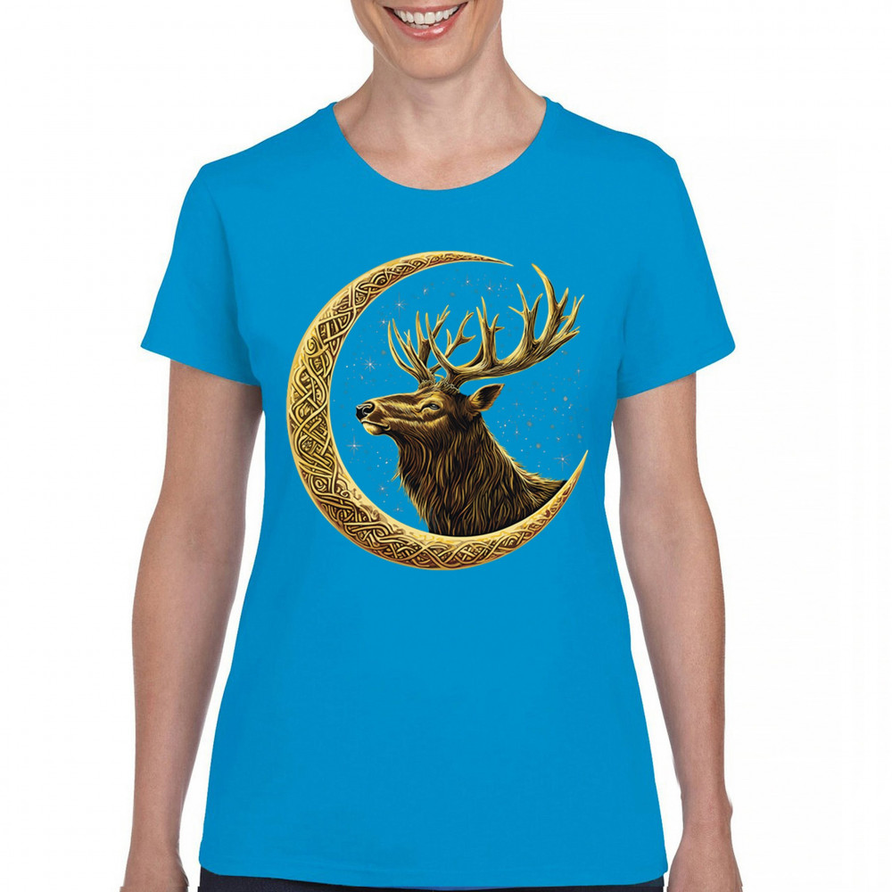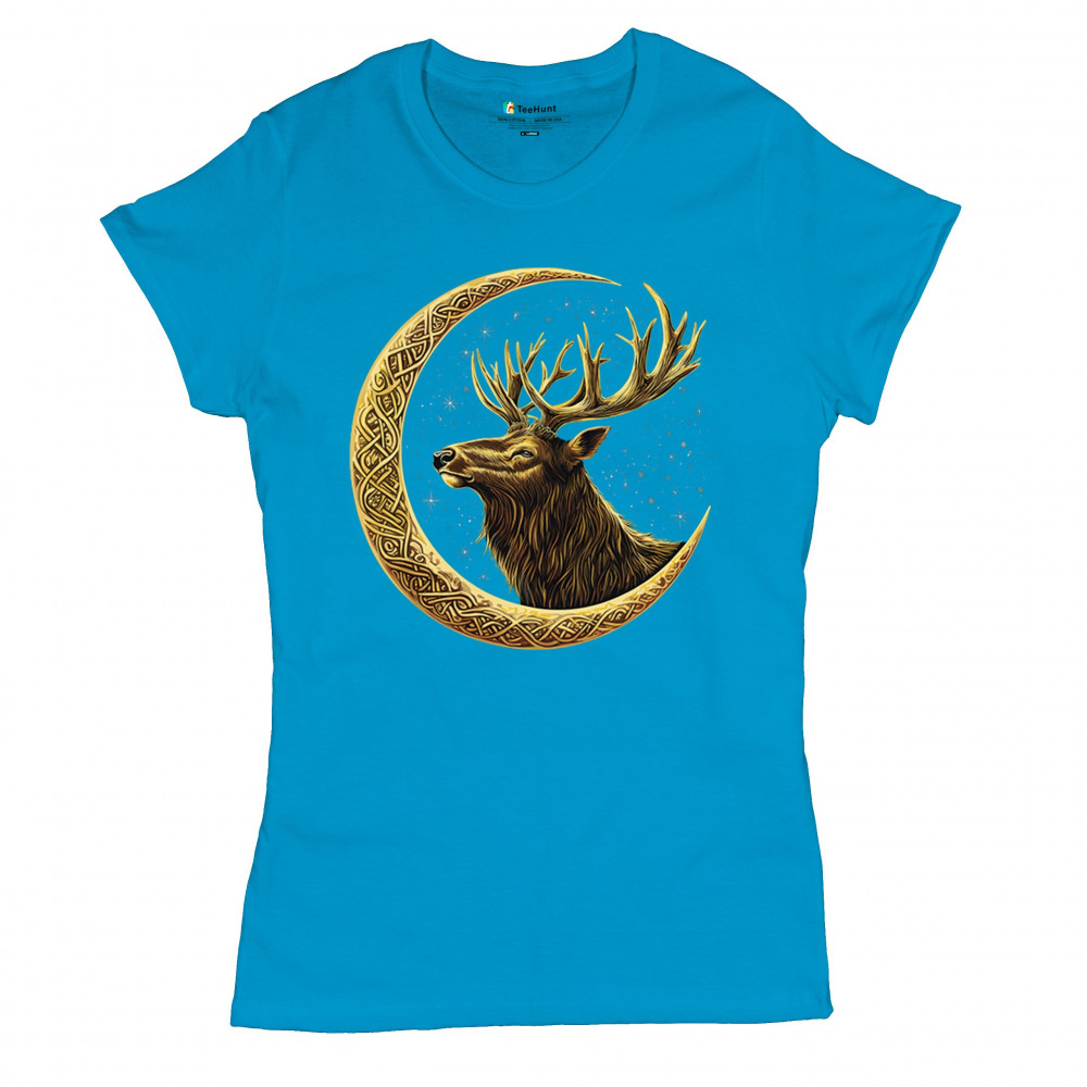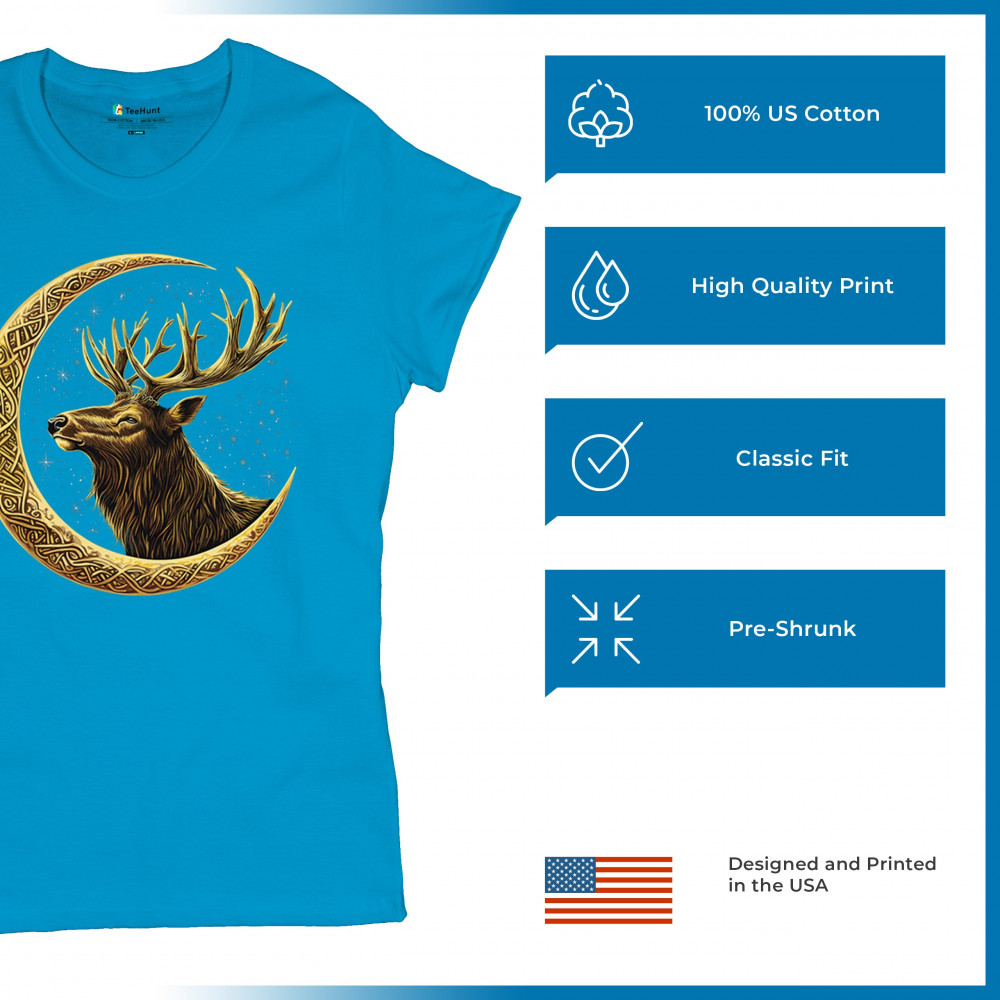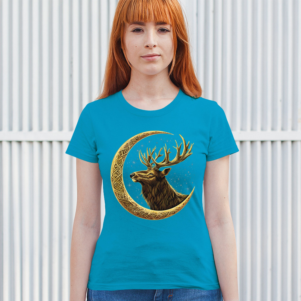 Celtic stag design with golden moon and cosmic stars. Symbolizes forest strength, leadership, and spiritual energy. Perfect for nature lovers.