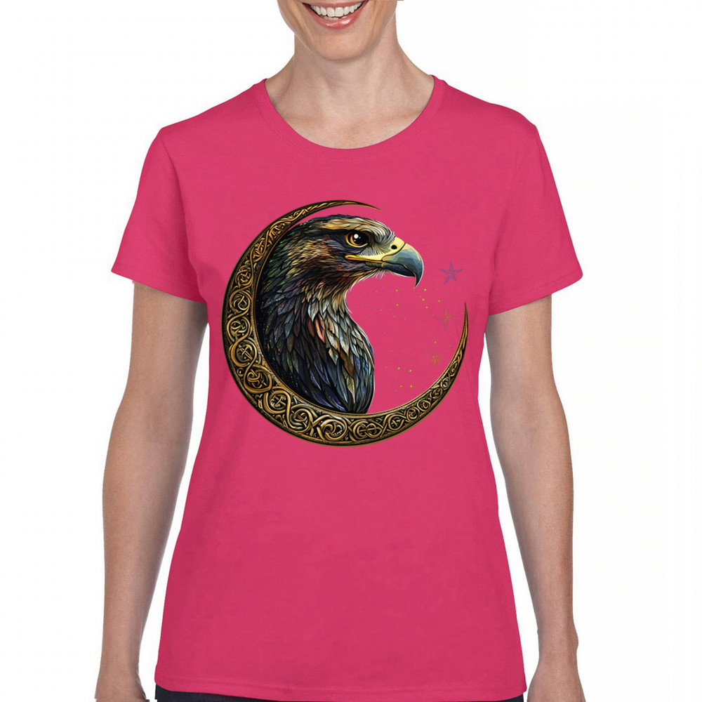 A beautifully detailed eagle with vibrant feathers is framed by a golden Celtic crescent moon and surrounded by a starry cosmic sky. This striking design represents freedom, spiritual power, and the mystery of the skies. Perfect for patriots, bird lovers, and those who connect with nature, tribal symbolism, and celestial art.