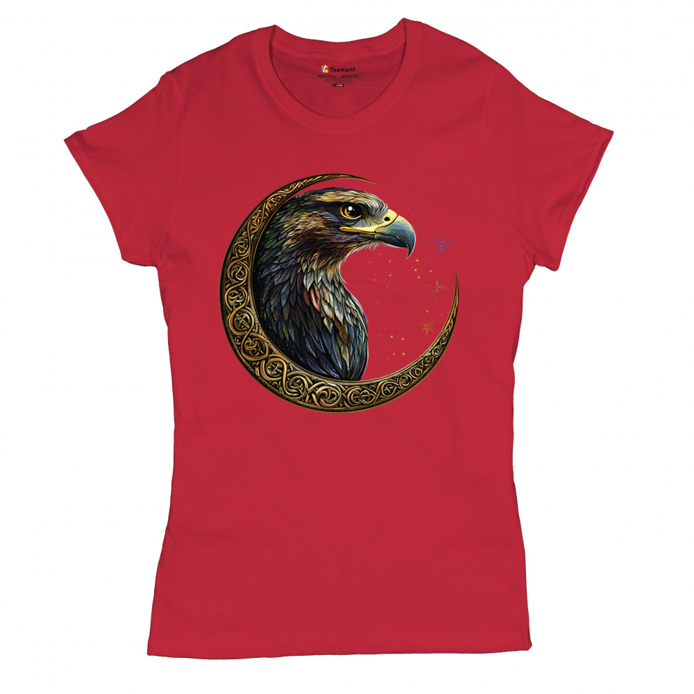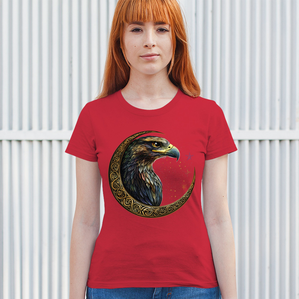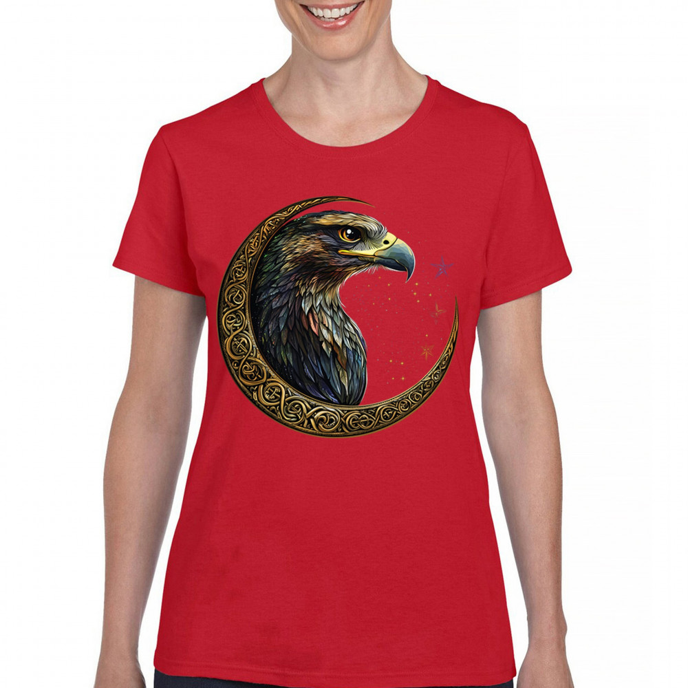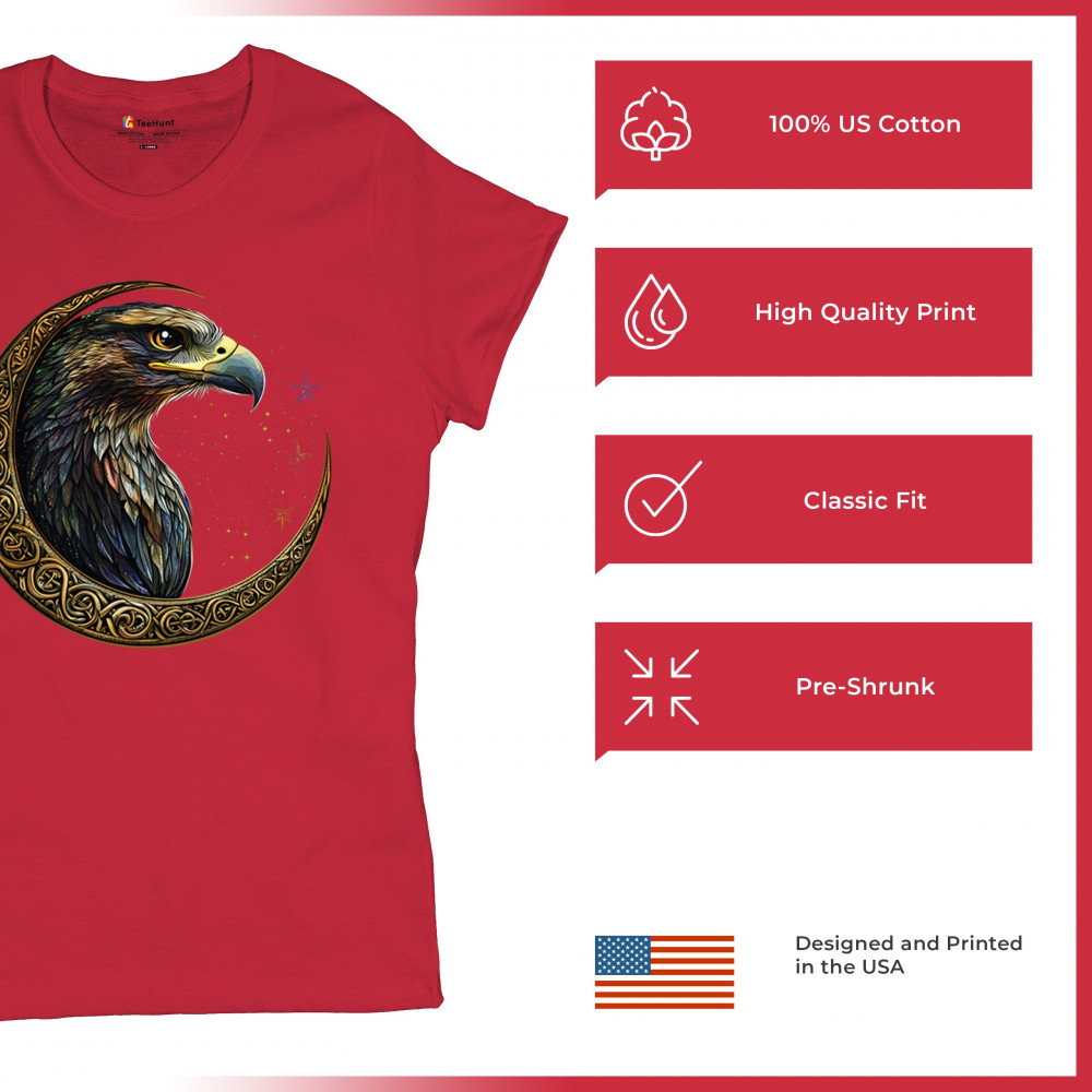 A beautifully detailed eagle with vibrant feathers is framed by a golden Celtic crescent moon and surrounded by a starry cosmic sky. This striking design represents freedom, spiritual power, and the mystery of the skies. Perfect for patriots, bird lovers, and those who connect with nature, tribal symbolism, and celestial art.
