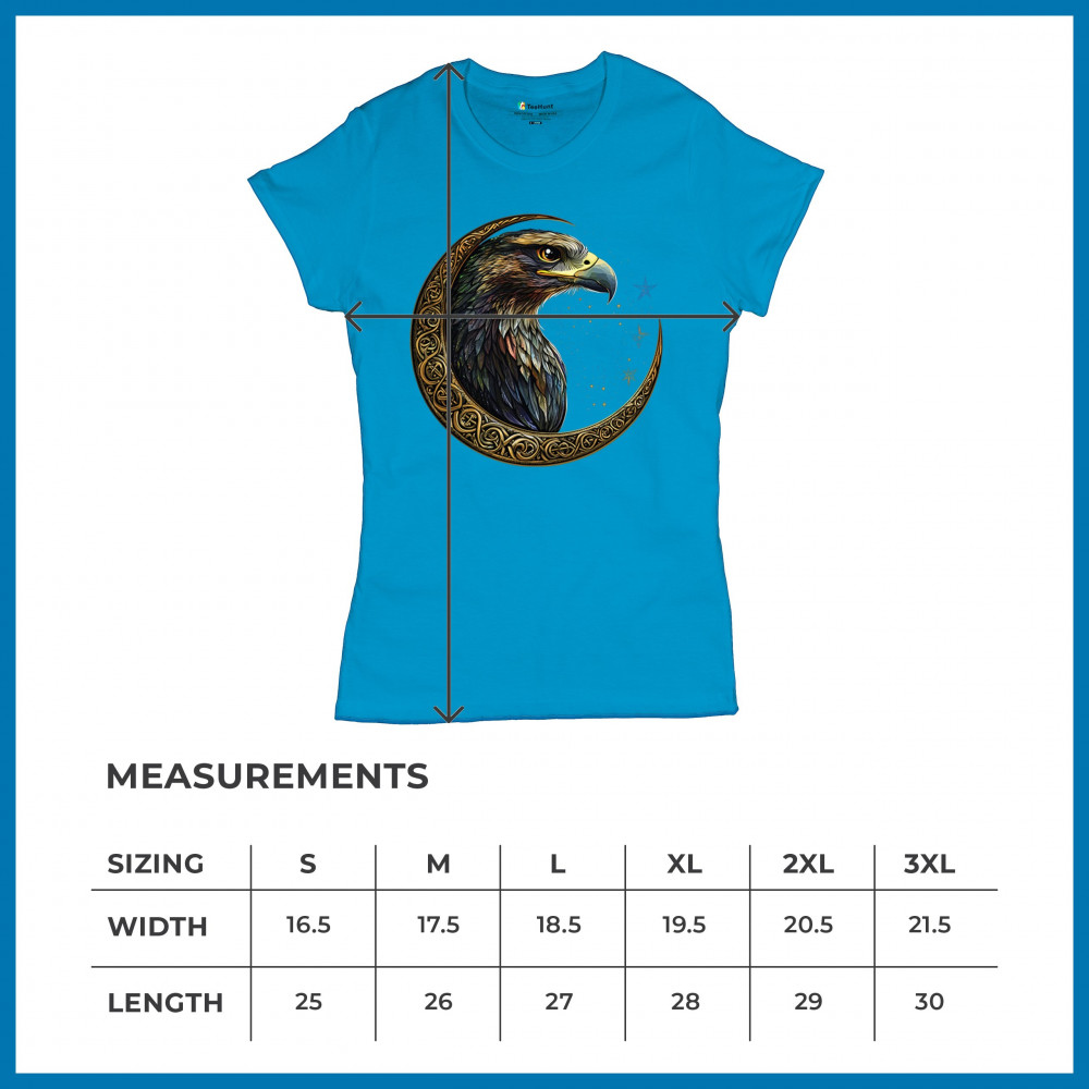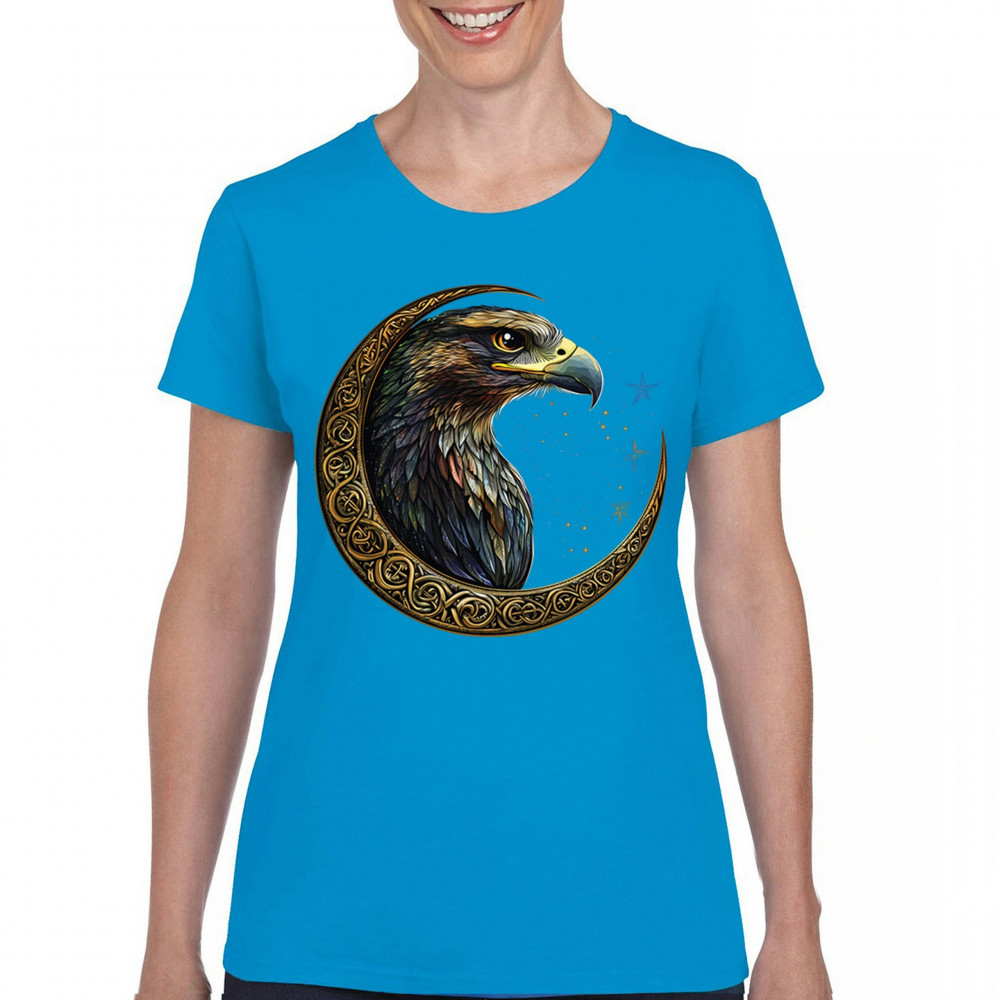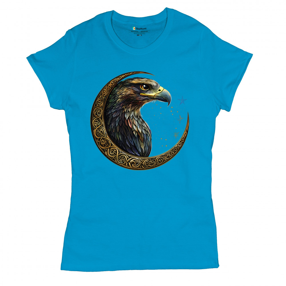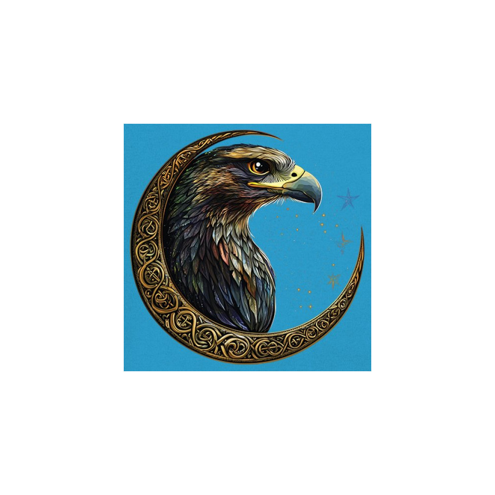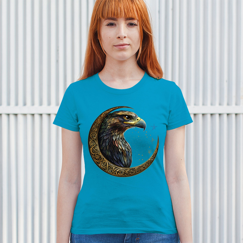 A beautifully detailed eagle with vibrant feathers is framed by a golden Celtic crescent moon and surrounded by a starry cosmic sky. This striking design represents freedom, spiritual power, and the mystery of the skies. Perfect for patriots, bird lovers, and those who connect with nature, tribal symbolism, and celestial art.