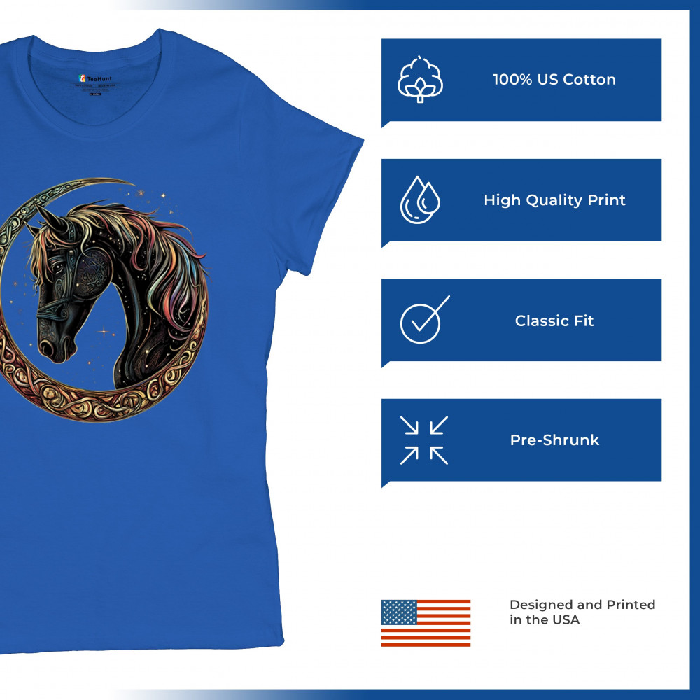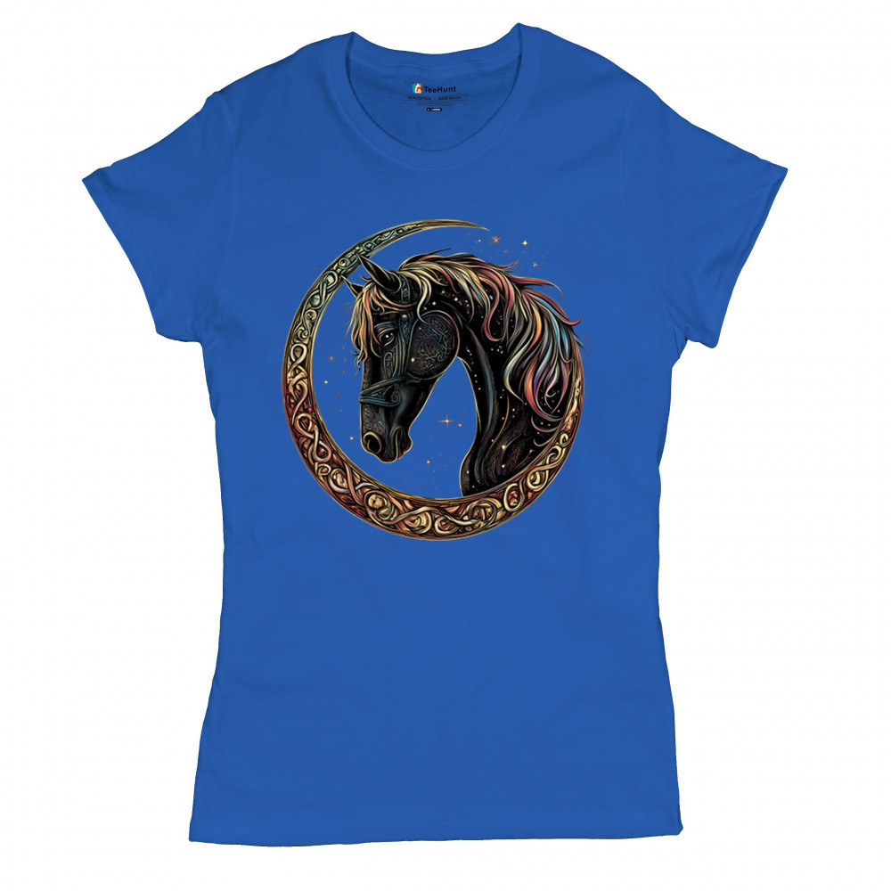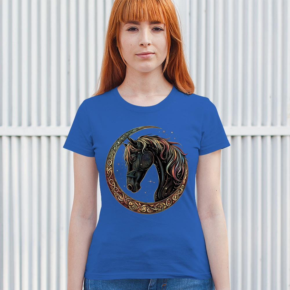 Celebrate the power and grace of the cosmos with this majestic black horse framed by a golden Celtic crescent moon. Its rainbow mane and celestial body symbolize strength, movement, mystery, and spiritual magic. A stunning piece for fantasy fans, equestrians, and dreamers who love horses and stars.