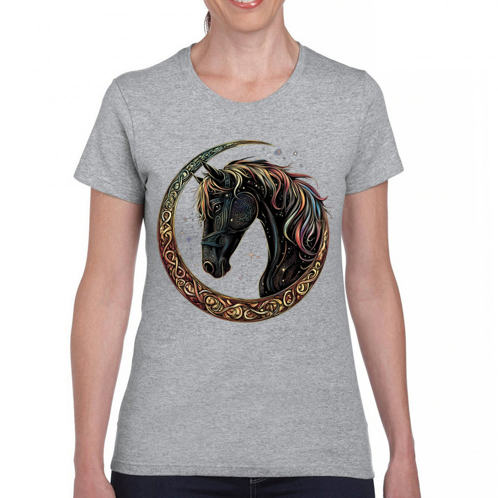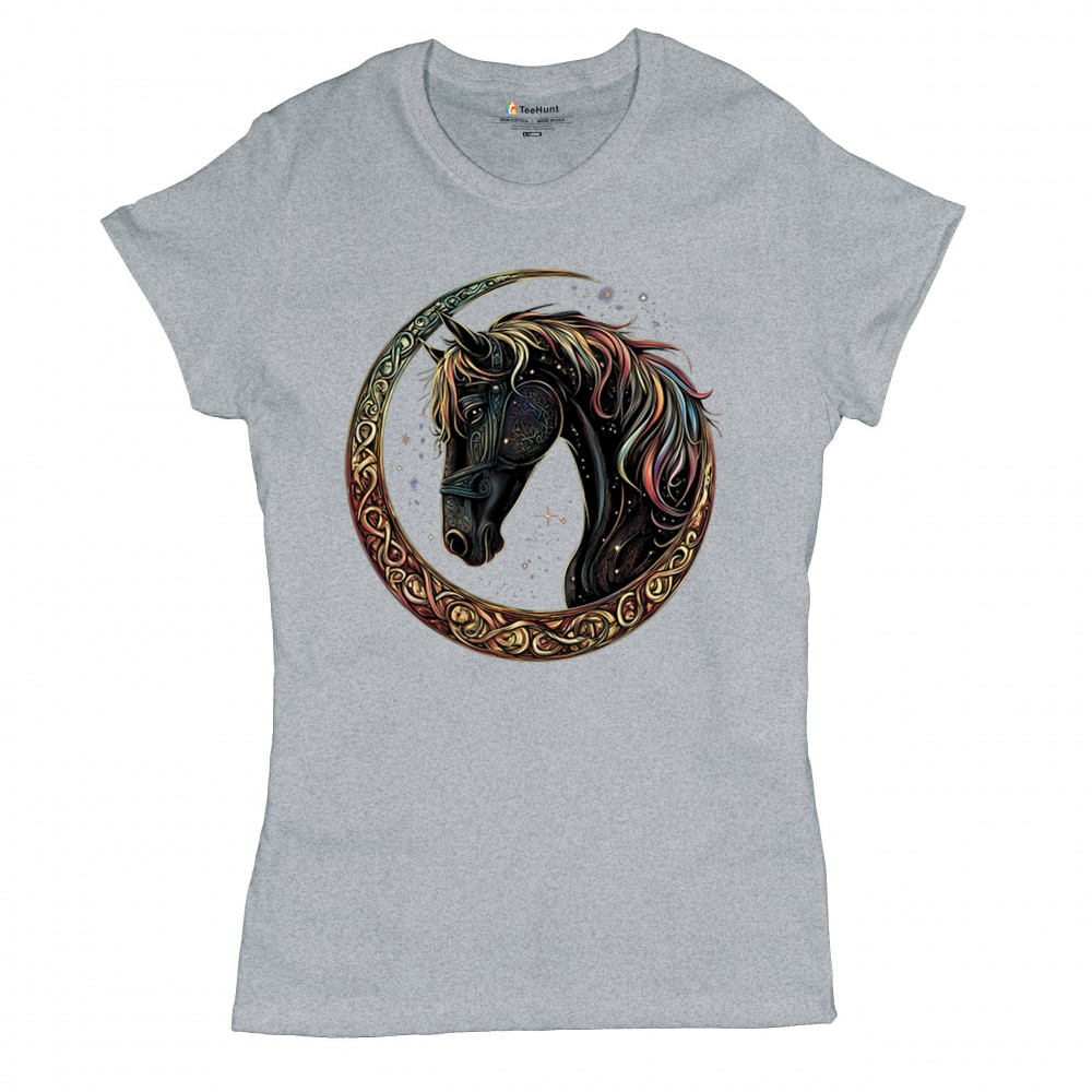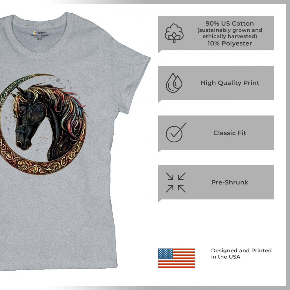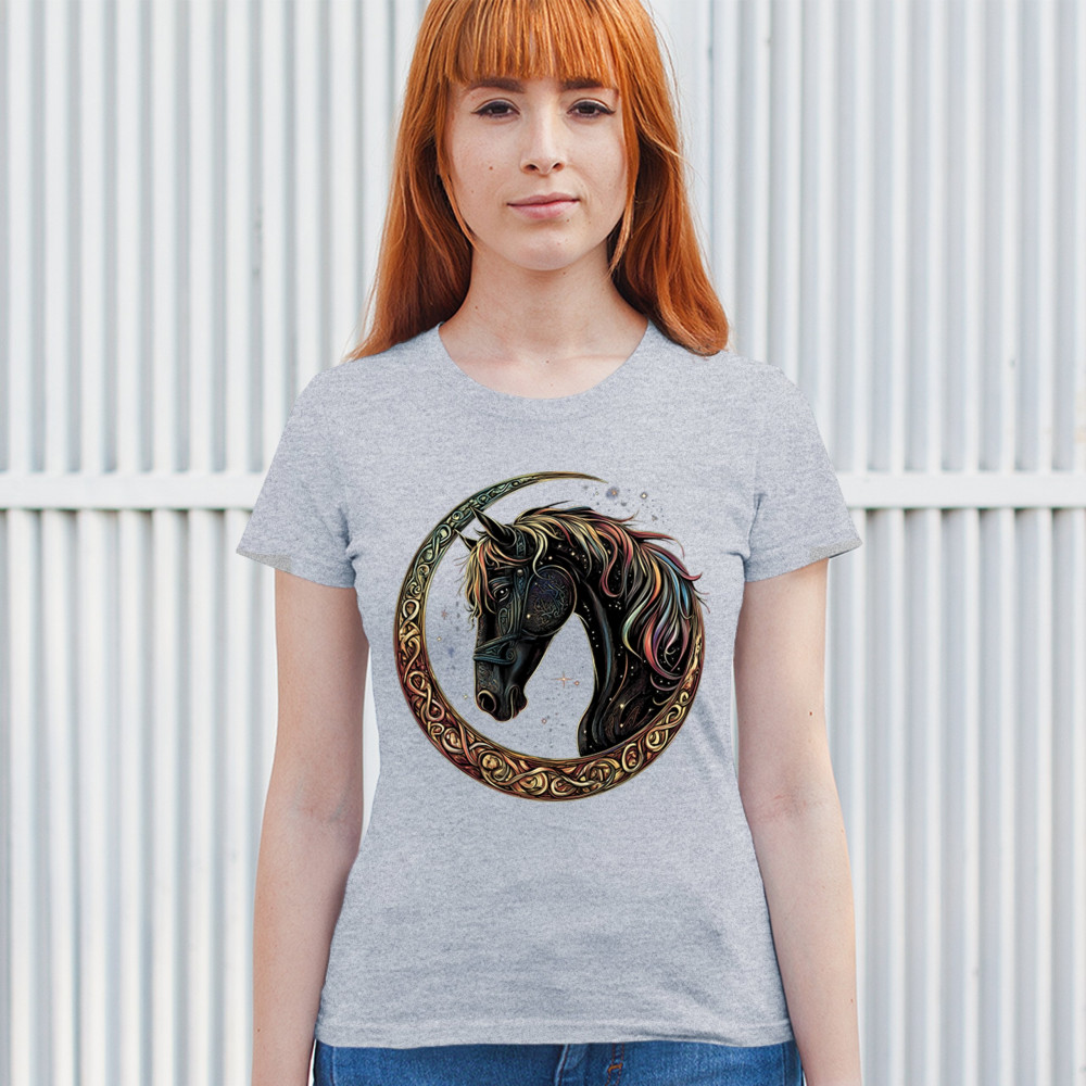 Celebrate the power and grace of the cosmos with this majestic black horse framed by a golden Celtic crescent moon. Its rainbow mane and celestial body symbolize strength, movement, mystery, and spiritual magic. A stunning piece for fantasy fans, equestrians, and dreamers who love horses and stars.