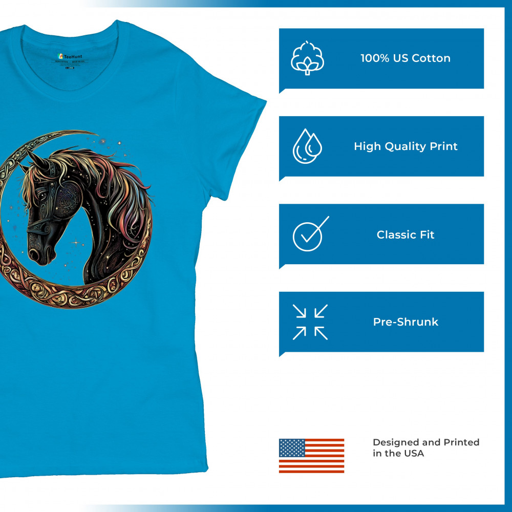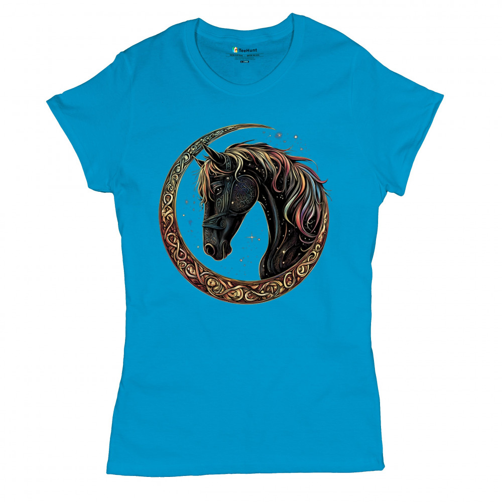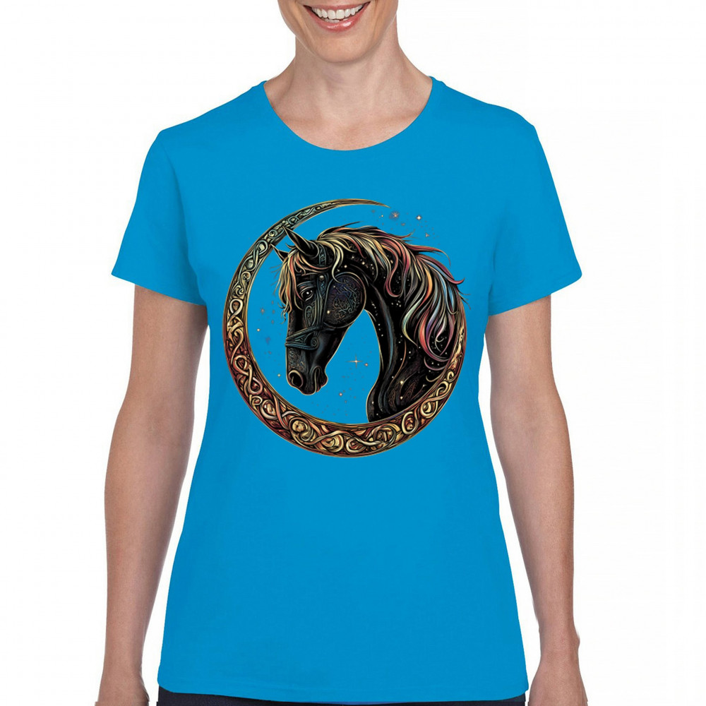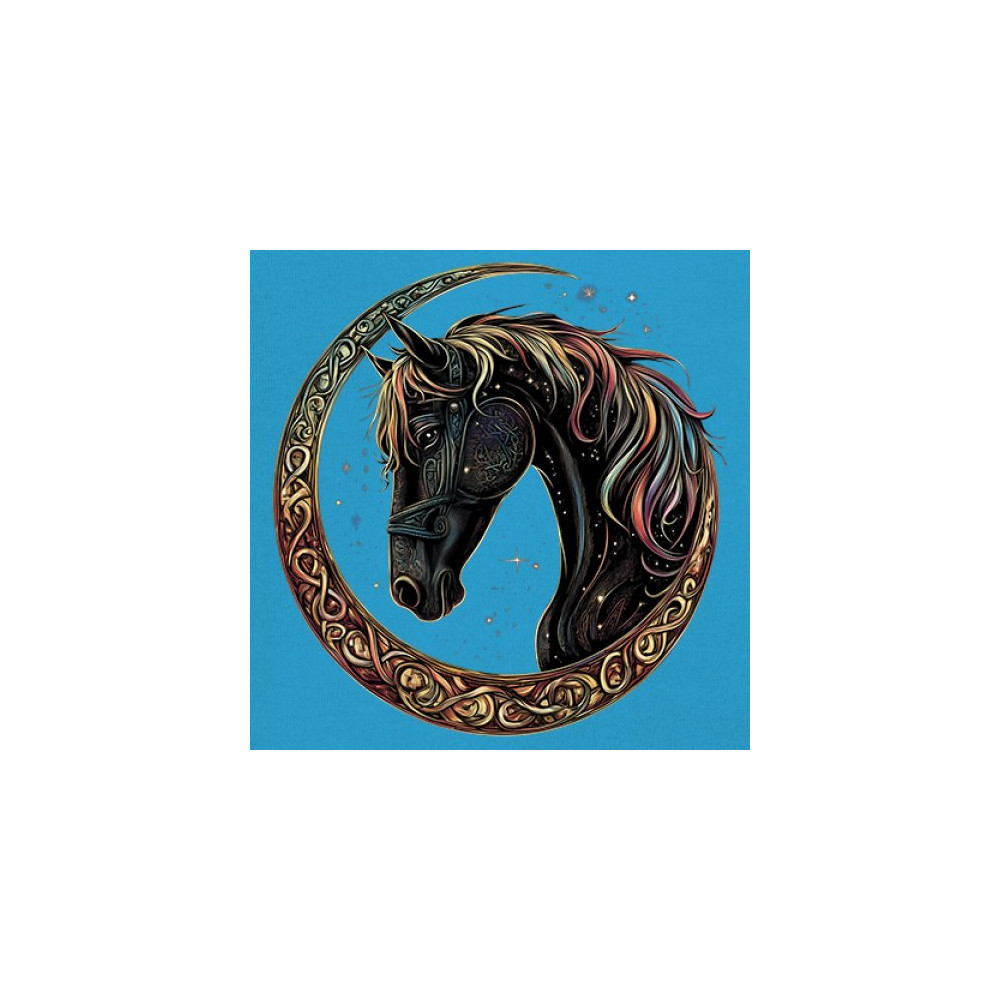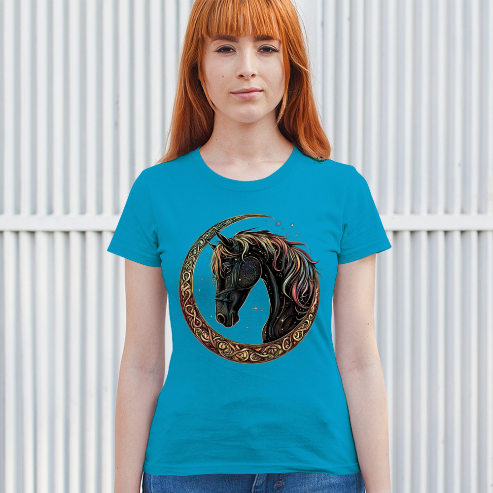 Celebrate the power and grace of the cosmos with this majestic black horse framed by a golden Celtic crescent moon. Its rainbow mane and celestial body symbolize strength, movement, mystery, and spiritual magic. A stunning piece for fantasy fans, equestrians, and dreamers who love horses and stars.