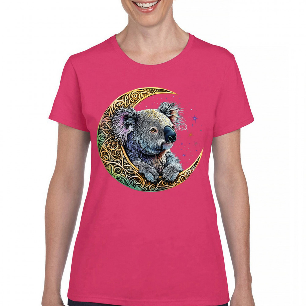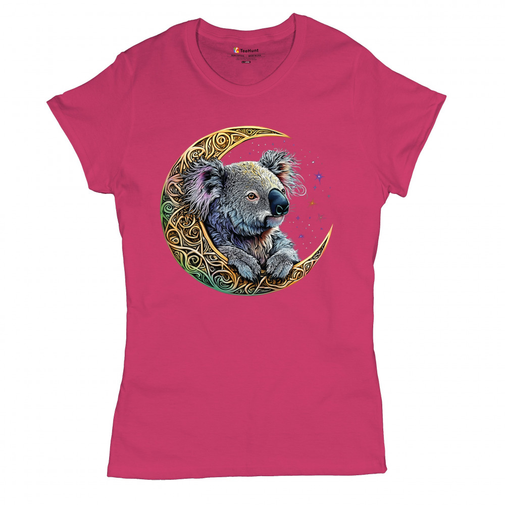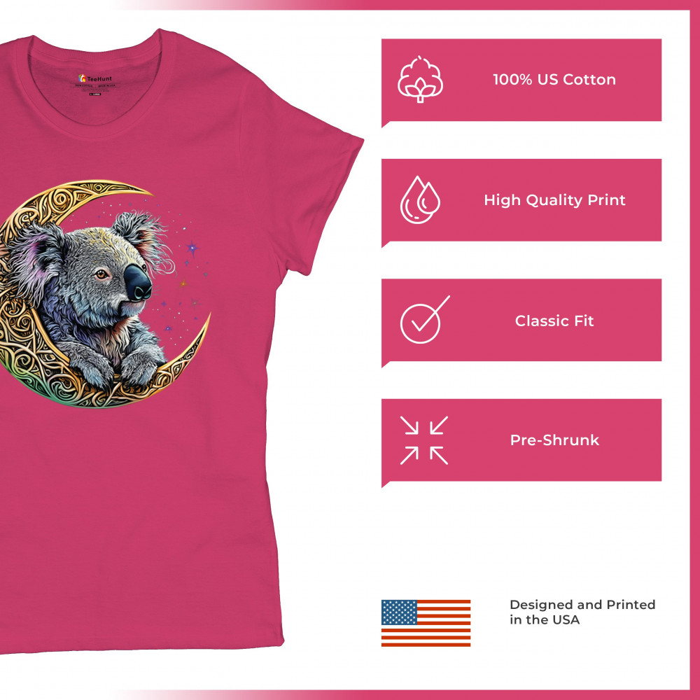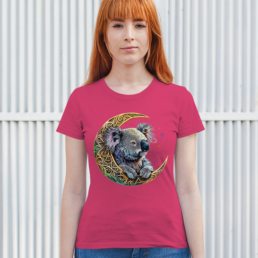Koala resting in Celtic crescent moon with cosmic sky. A peaceful design for nature lovers, spiritual thinkers, and fantasy art fans.