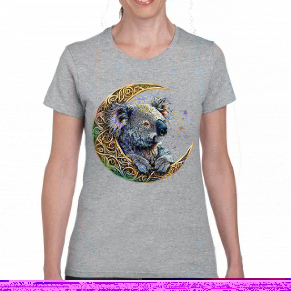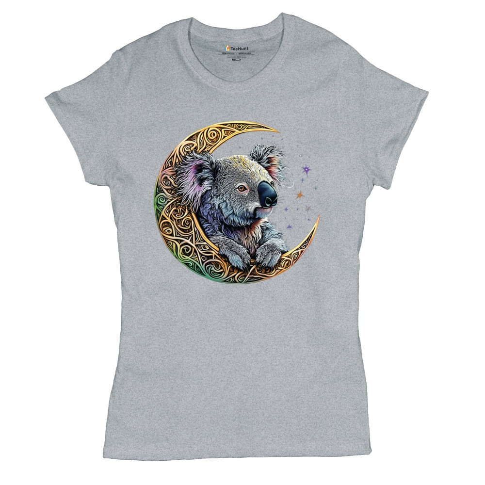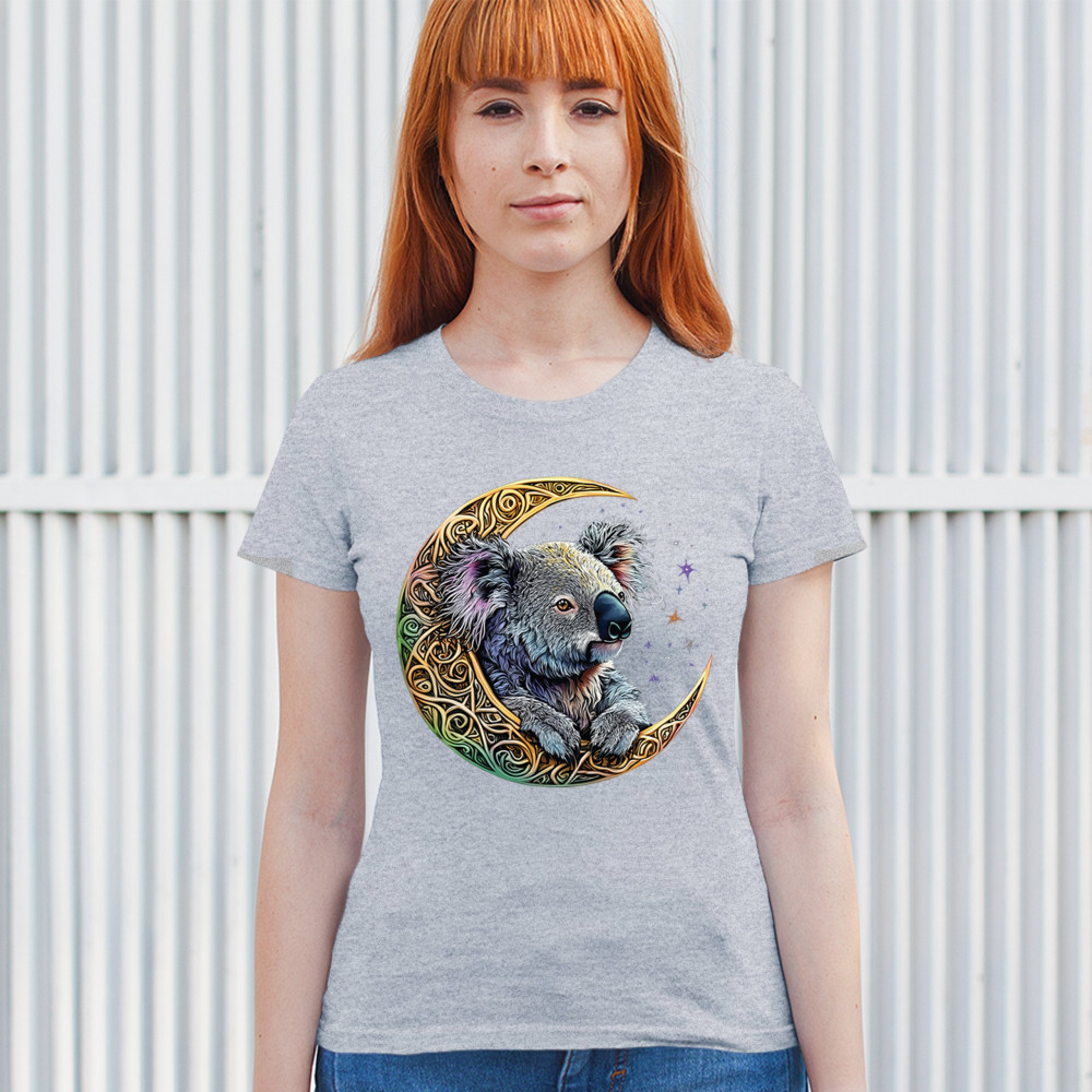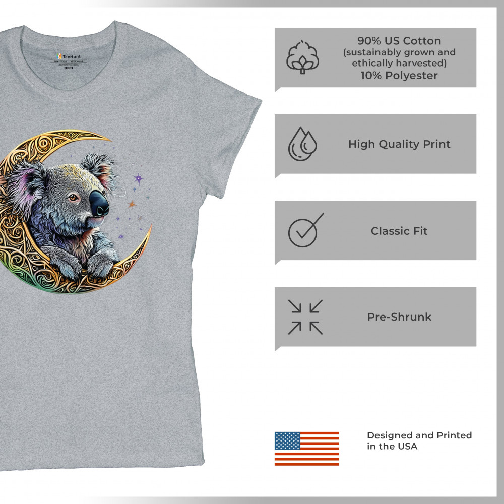 Koala resting in Celtic crescent moon with cosmic sky. A peaceful design for nature lovers, spiritual thinkers, and fantasy art fans.