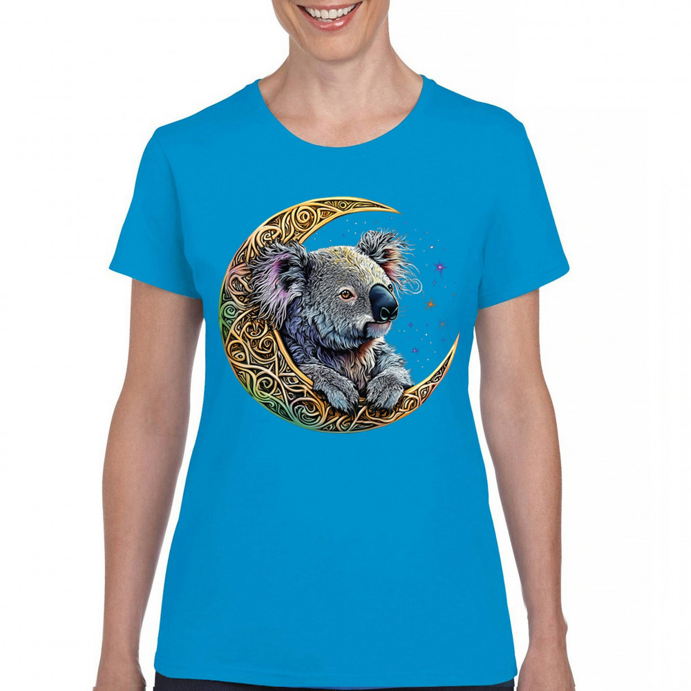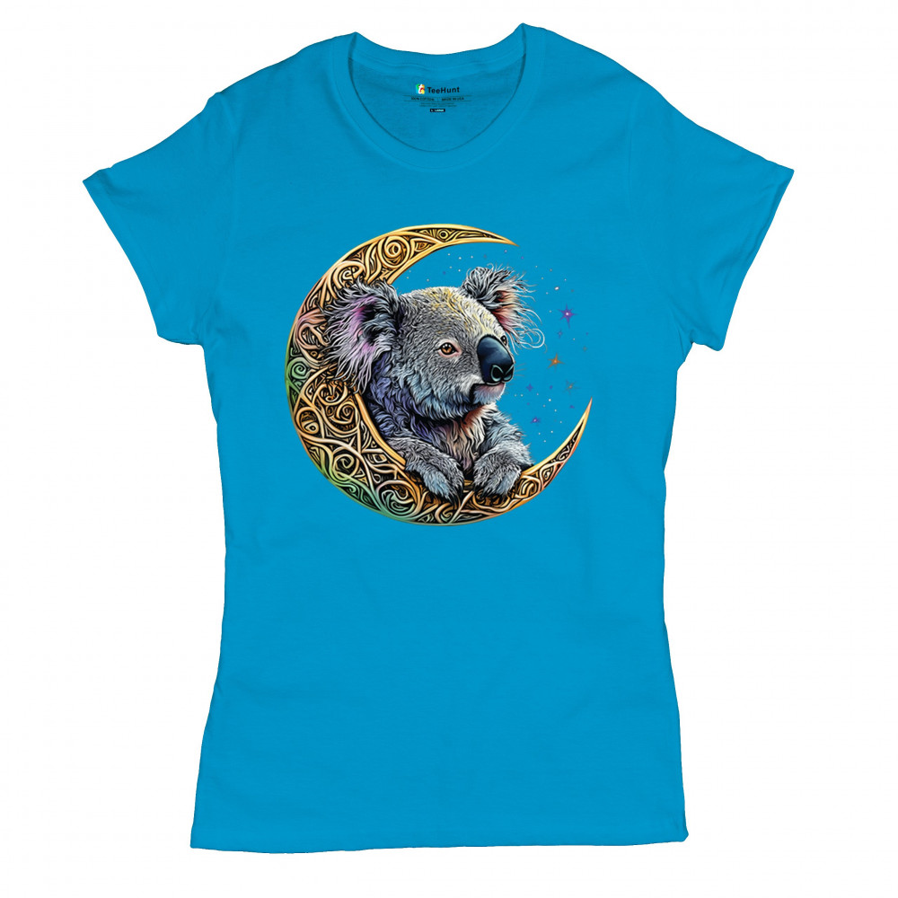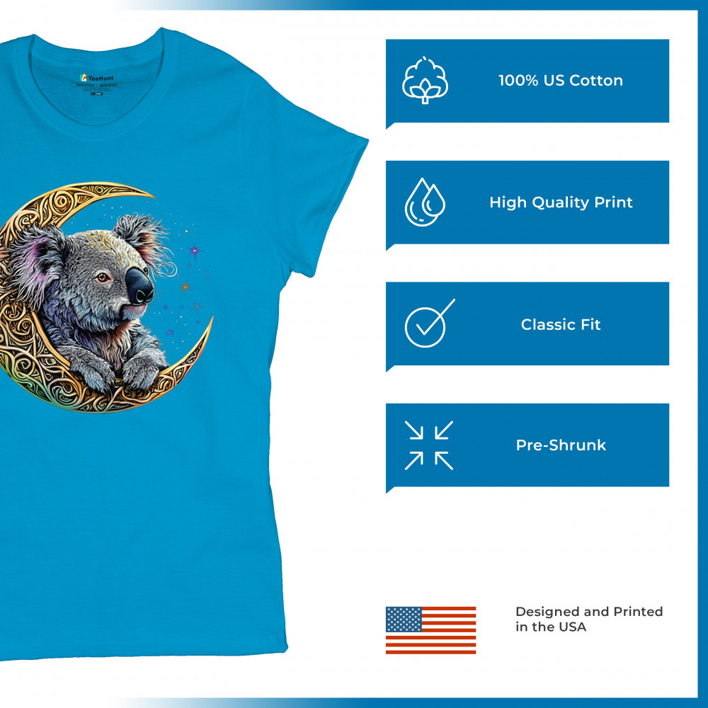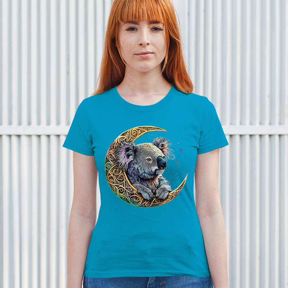 Koala resting in Celtic crescent moon with cosmic sky. A peaceful design for nature lovers, spiritual thinkers, and fantasy art fans.