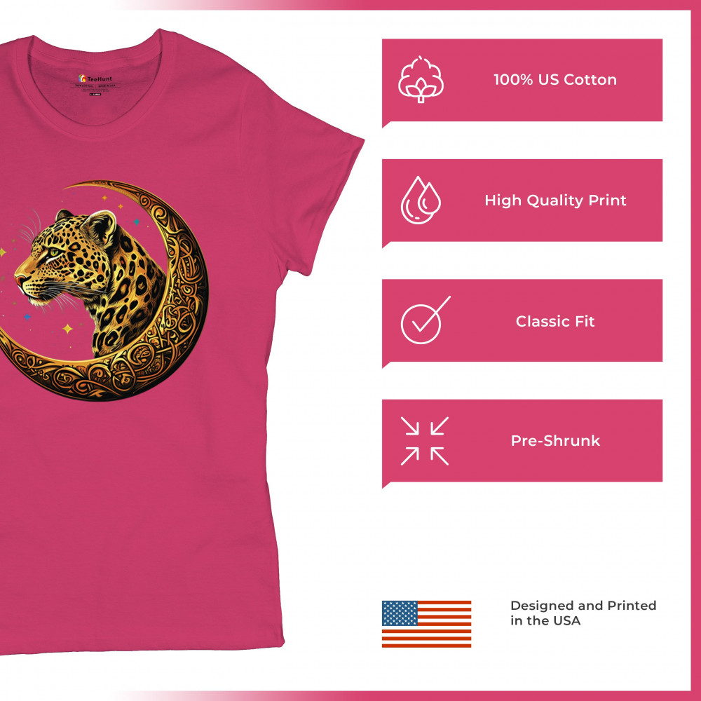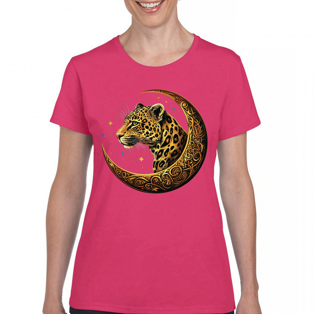 Leopard in Celtic moon with cosmic background. A fierce and spiritual design for big cat lovers, jungle fans, mystics, and fantasy art seekers.