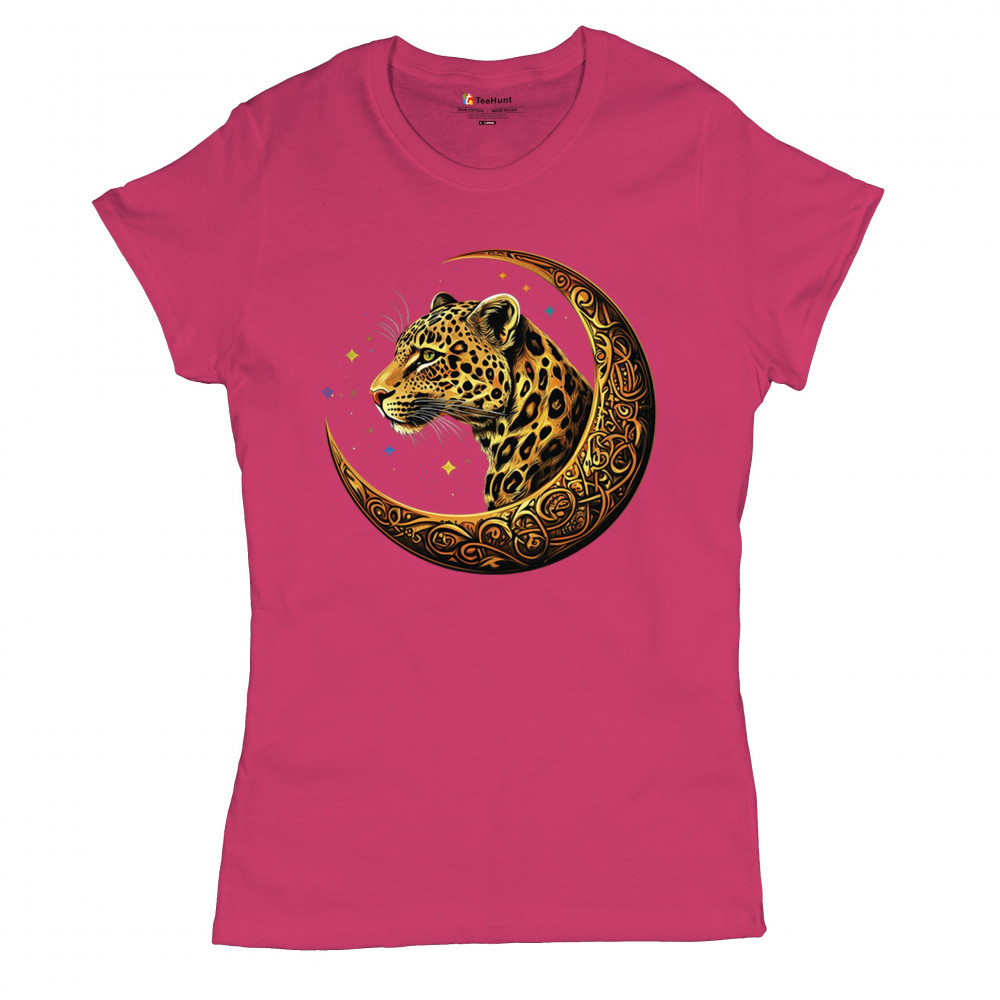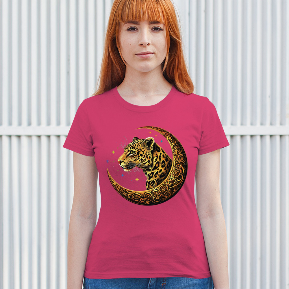 Unleash wild energy and spiritual symbolism with this bold leopard design set inside a golden Celtic crescent moon. A cosmic starry background amplifies its mystical vibe, symbolizing agility, independence, and awareness. Perfect for big cat lovers, jungle animal fans, and seekers of fantasy or tribal-inspired art.