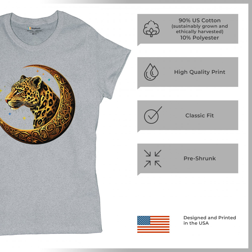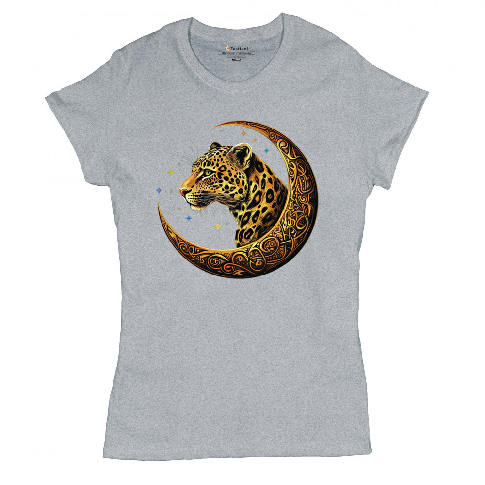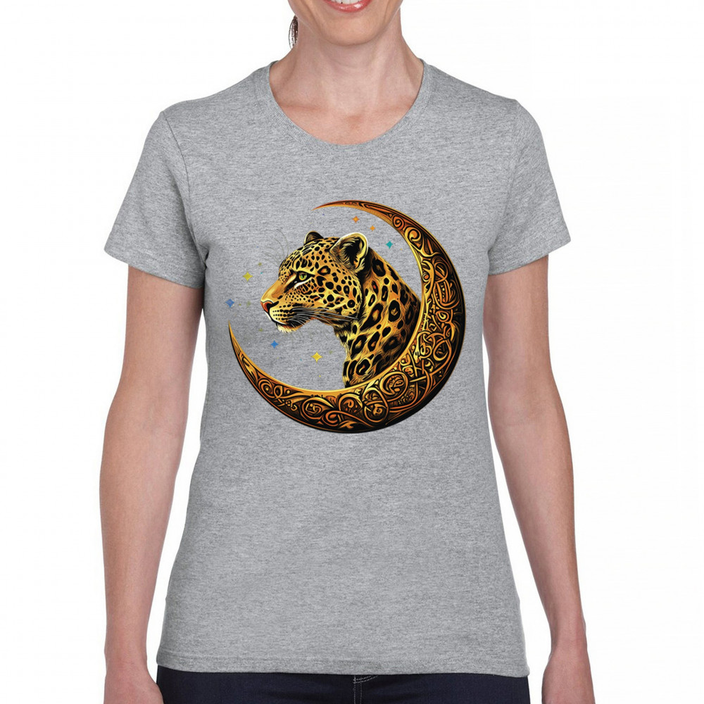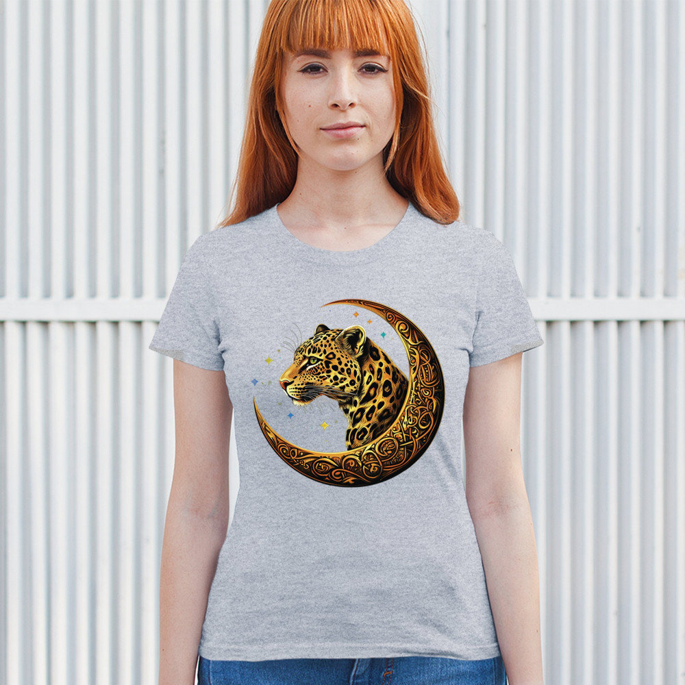 Unleash wild energy and spiritual symbolism with this bold leopard design set inside a golden Celtic crescent moon. A cosmic starry background amplifies its mystical vibe, symbolizing agility, independence, and awareness. Perfect for big cat lovers, jungle animal fans, and seekers of fantasy or tribal-inspired art.