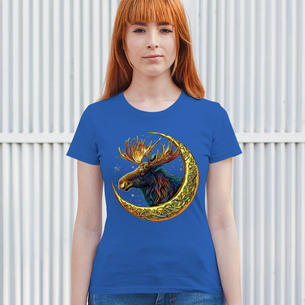 Mystical moose in gold Celtic crescent moon design—symbolizes strength, nature wisdom, and cosmic spirit for fantasy lovers and woodland fans.