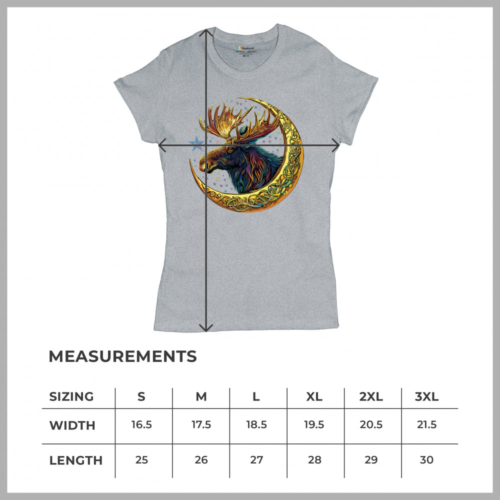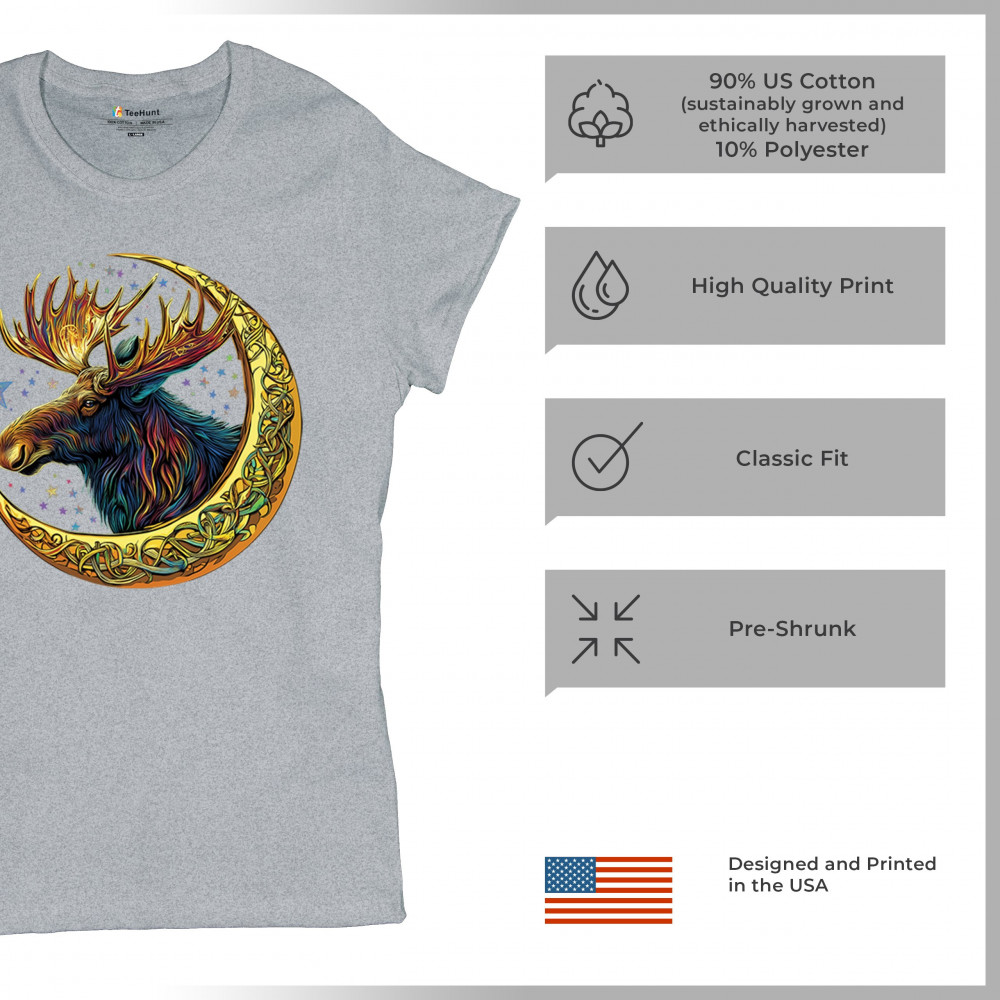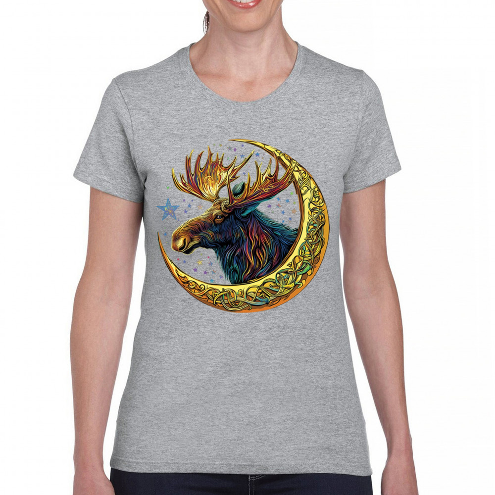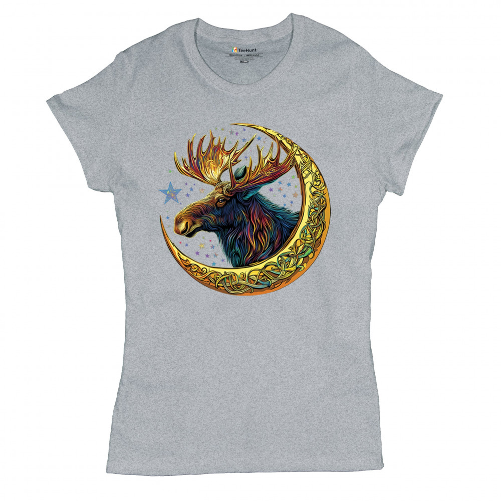 Mystical moose in gold Celtic crescent moon design—symbolizes strength, nature wisdom, and cosmic spirit for fantasy lovers and woodland fans.