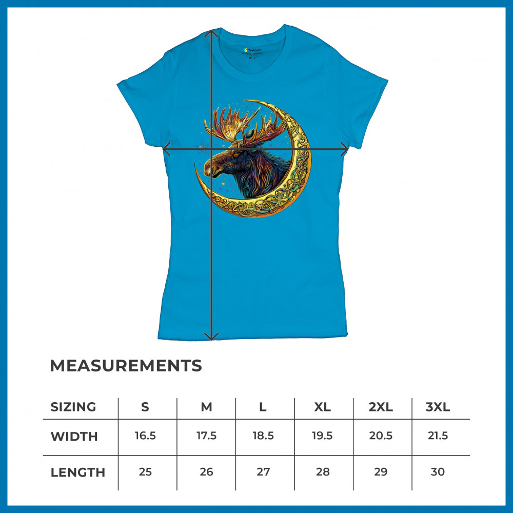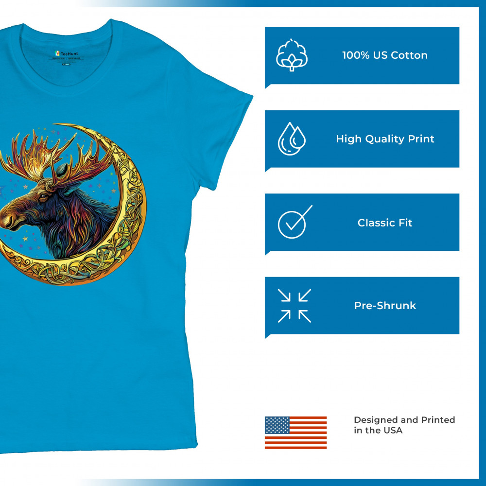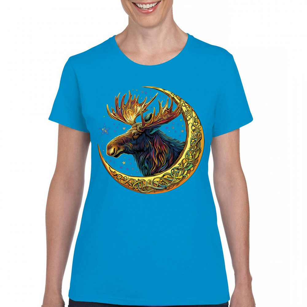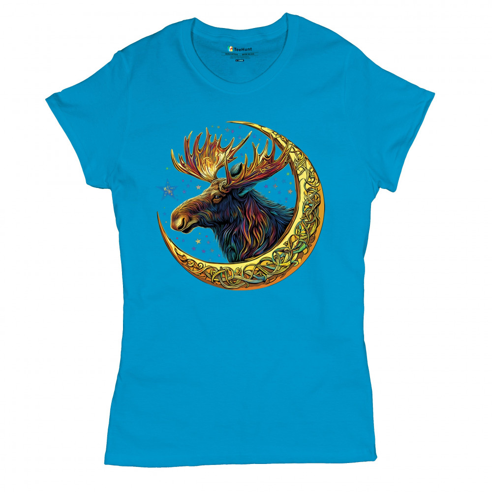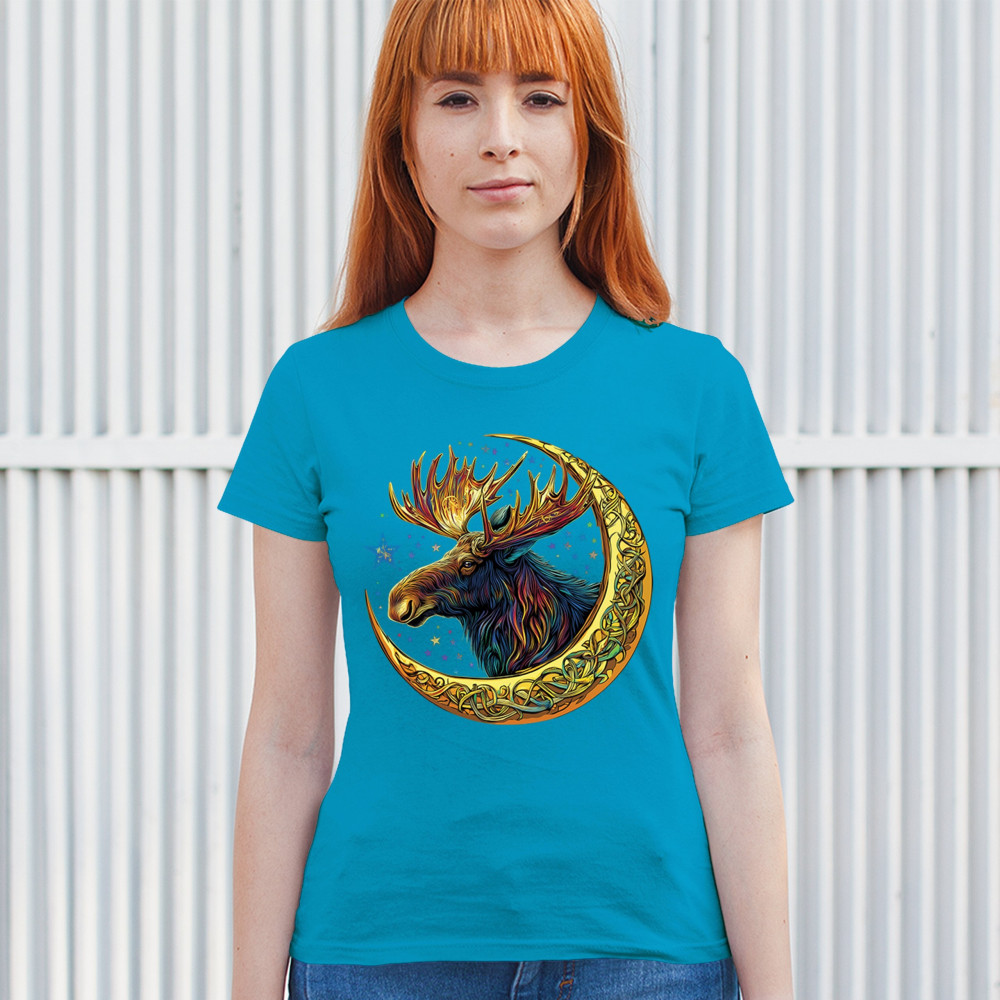 Mystical moose in gold Celtic crescent moon design—symbolizes strength, nature wisdom, and cosmic spirit for fantasy lovers and woodland fans.