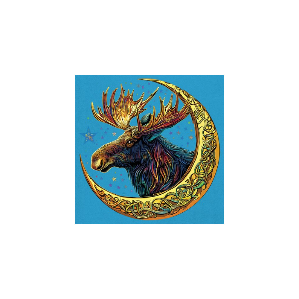 This vibrant moose design blends tribal art and fantasy energy with a golden Celtic crescent moon. Cosmic fur, radiant antlers, and a star-speckled sky make this image a symbol of strength, natural wisdom, and mysticism. Ideal for druids, hunters, fantasy fans, or spirit animal seekers connected to the forest and celestial realm.