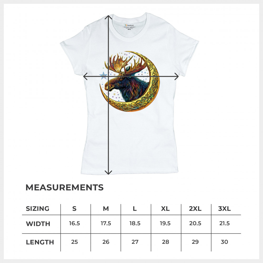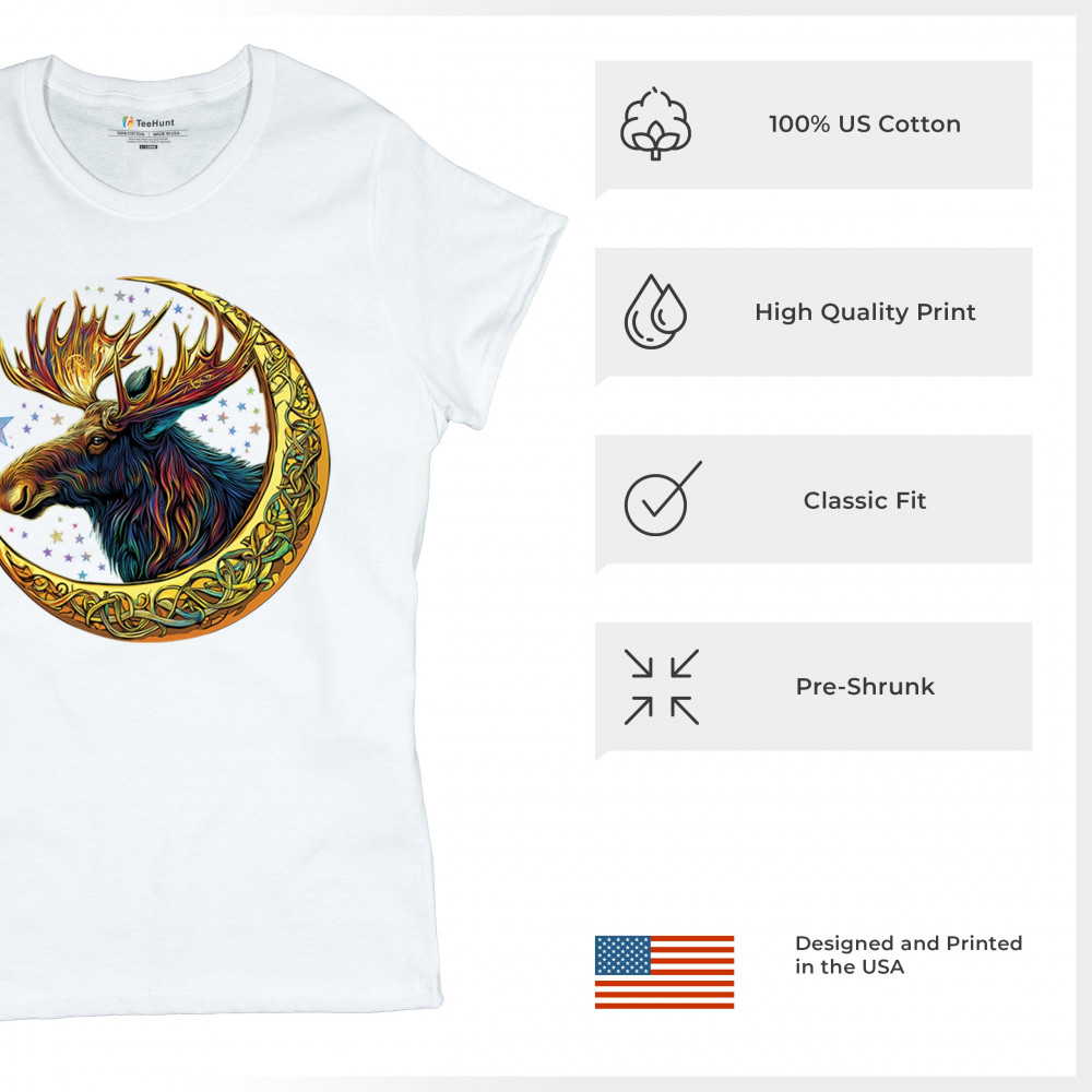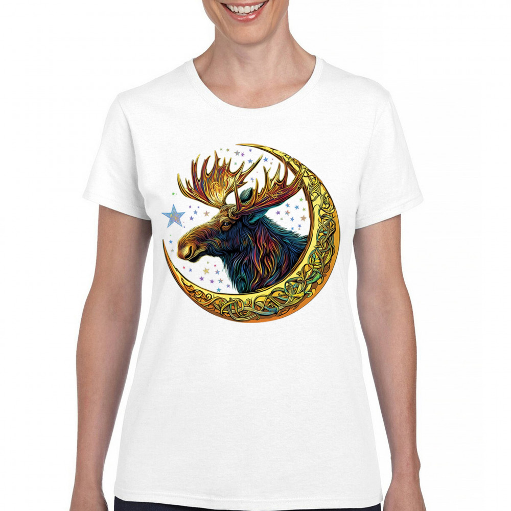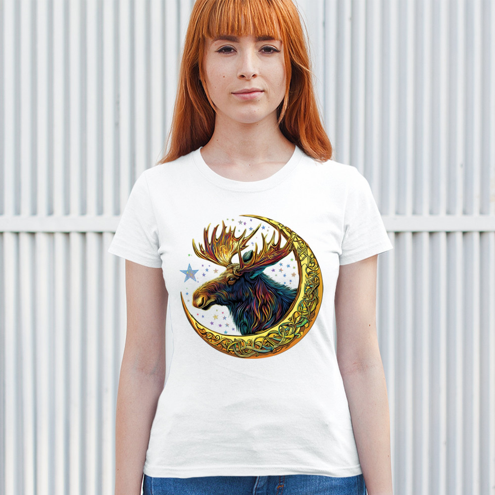 Mystical moose in gold Celtic crescent moon design—symbolizes strength, nature wisdom, and cosmic spirit for fantasy lovers and woodland fans.