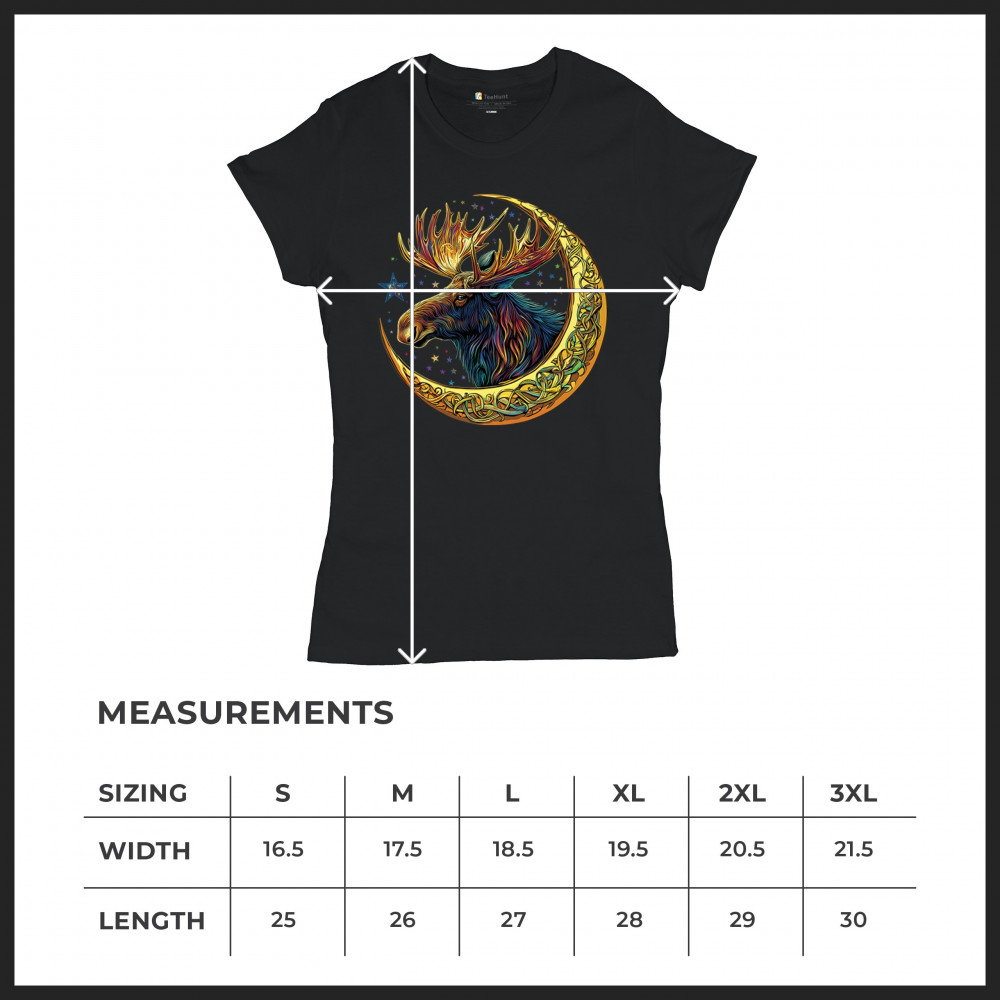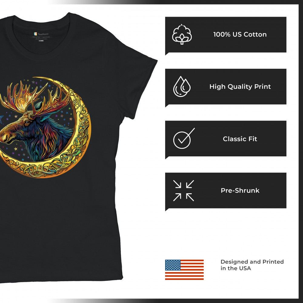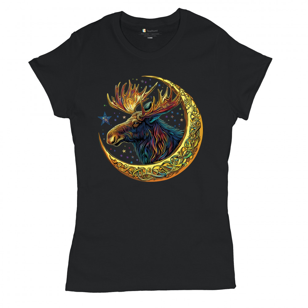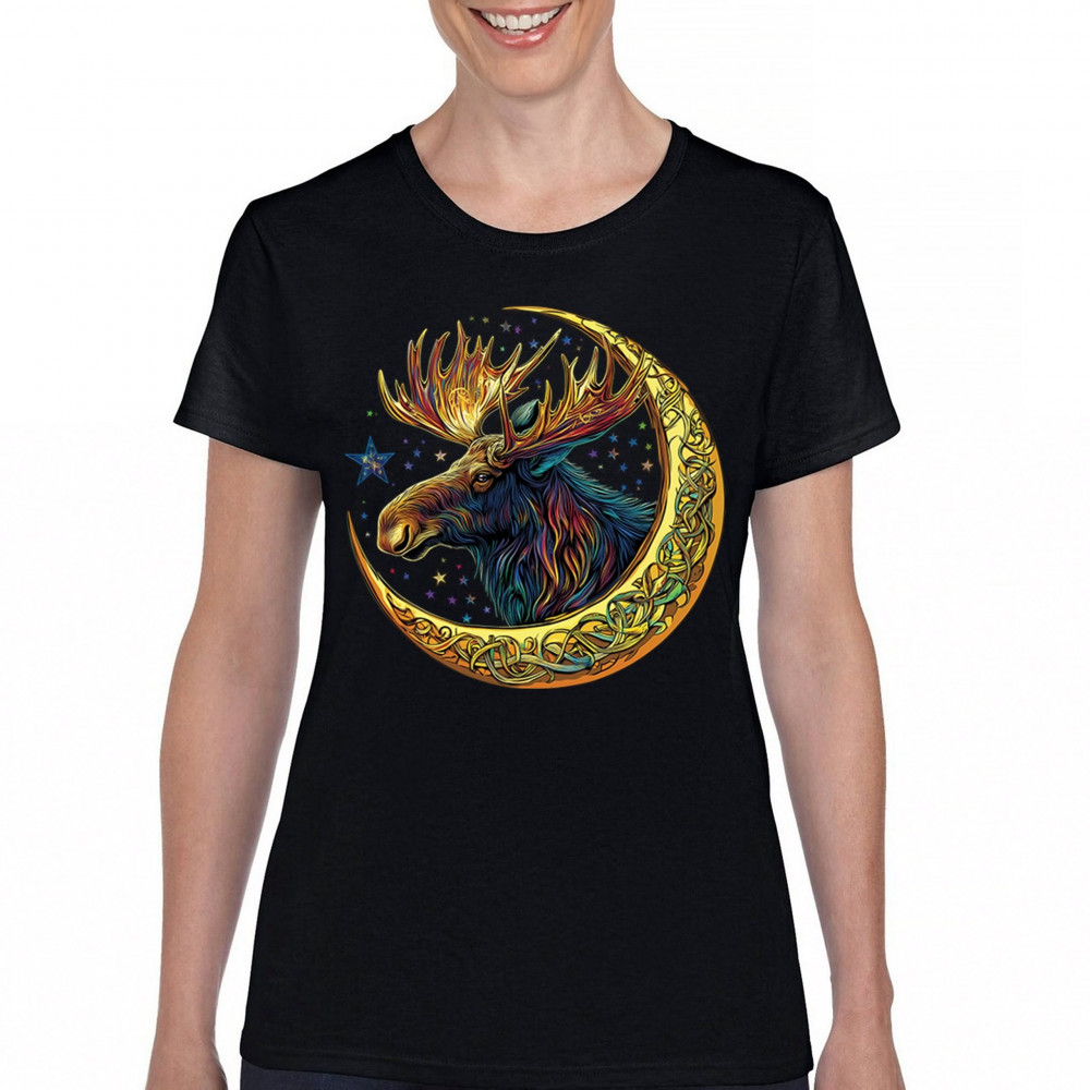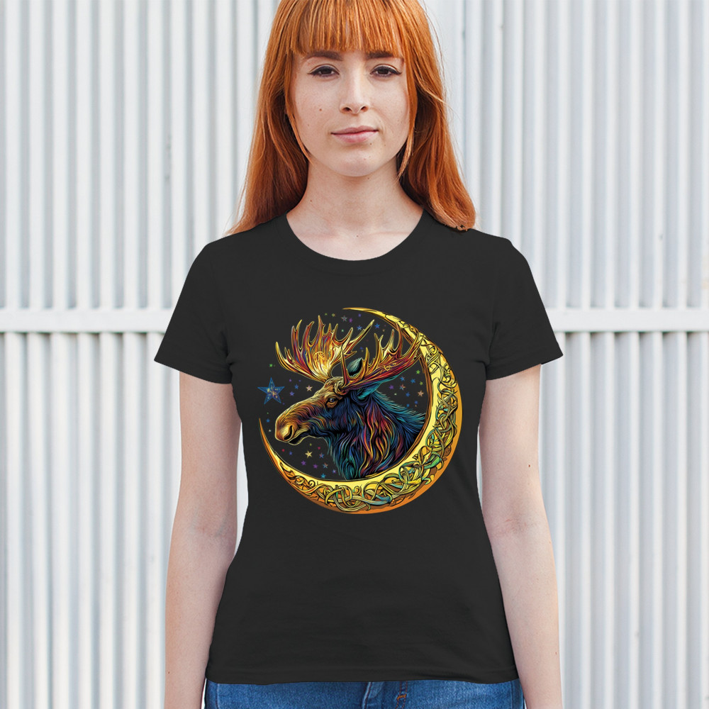 Mystical moose in gold Celtic crescent moon design—symbolizes strength, nature wisdom, and cosmic spirit for fantasy lovers and woodland fans.