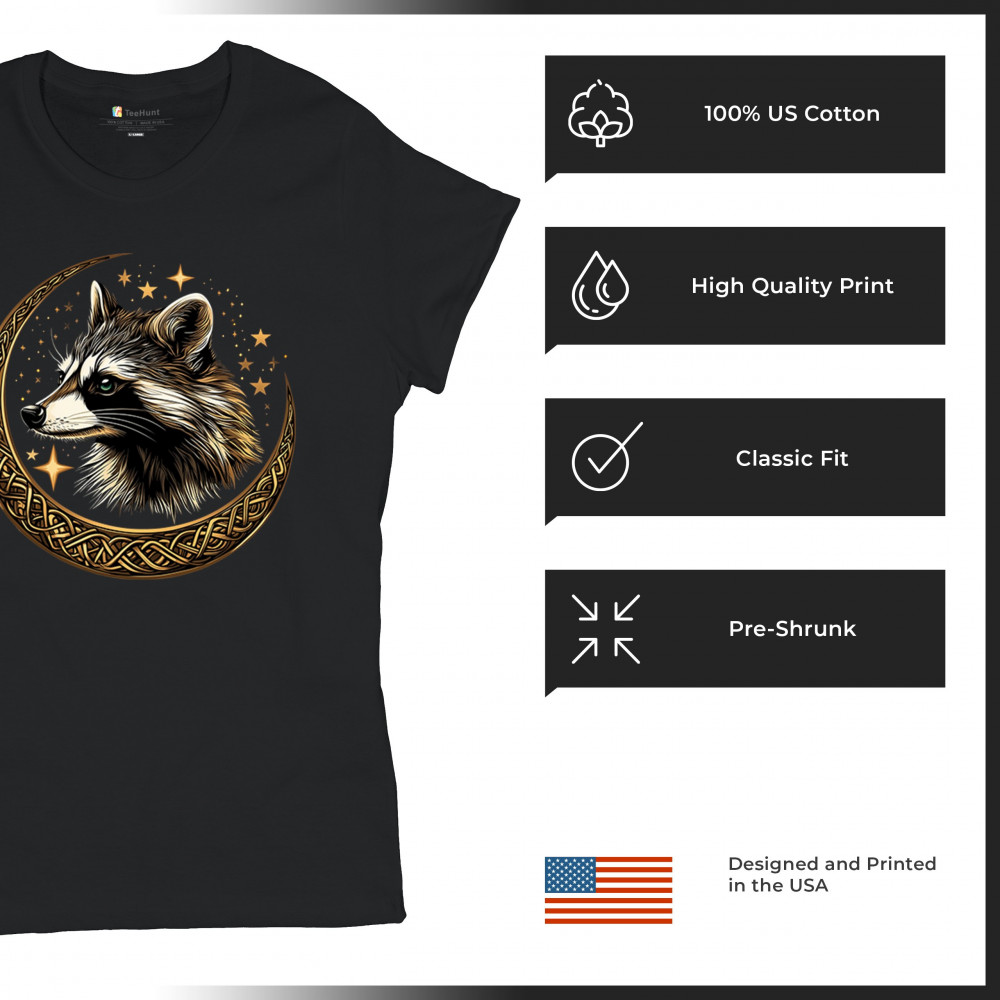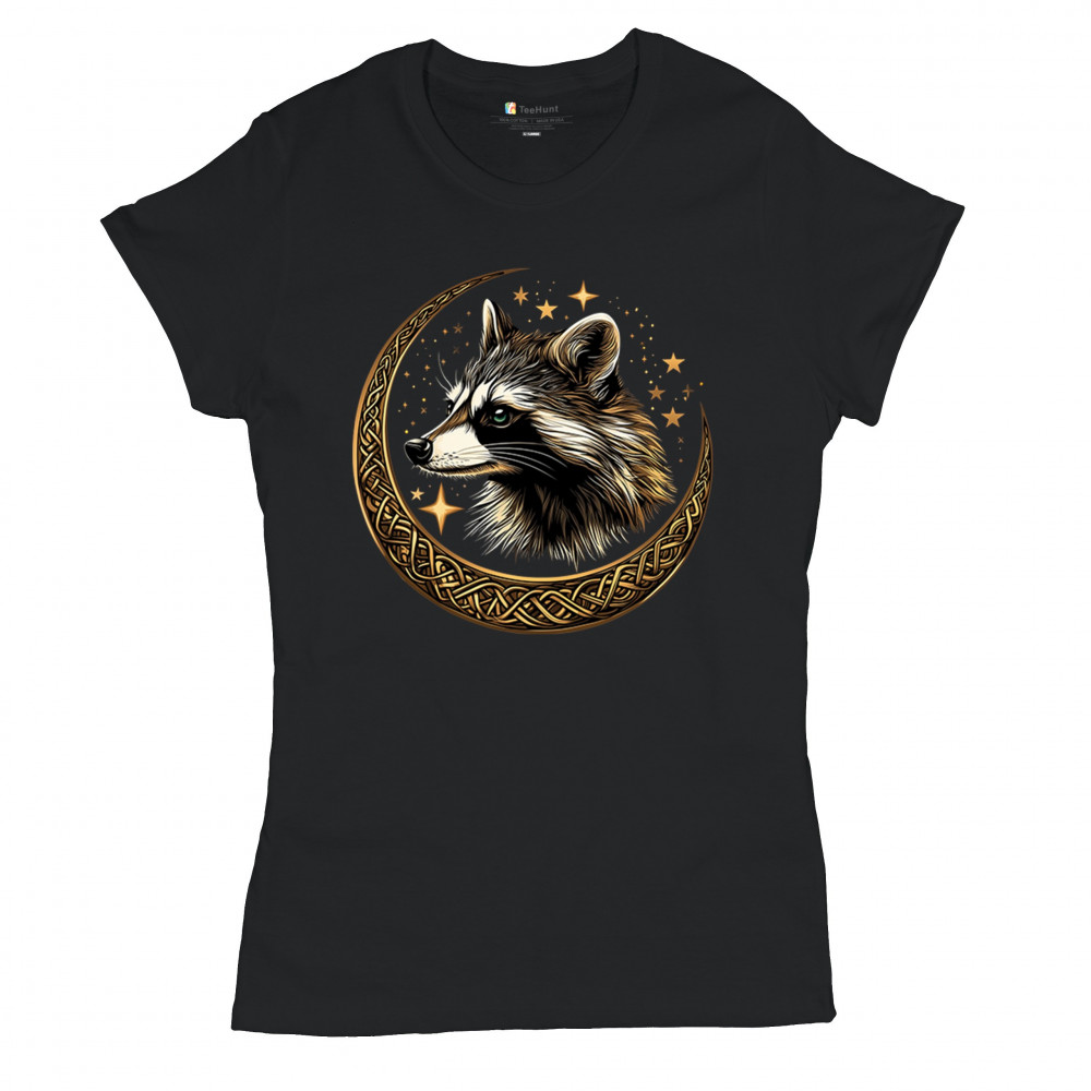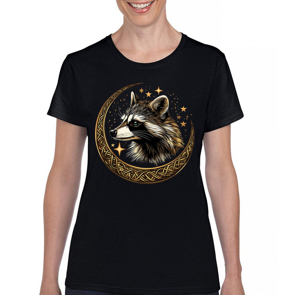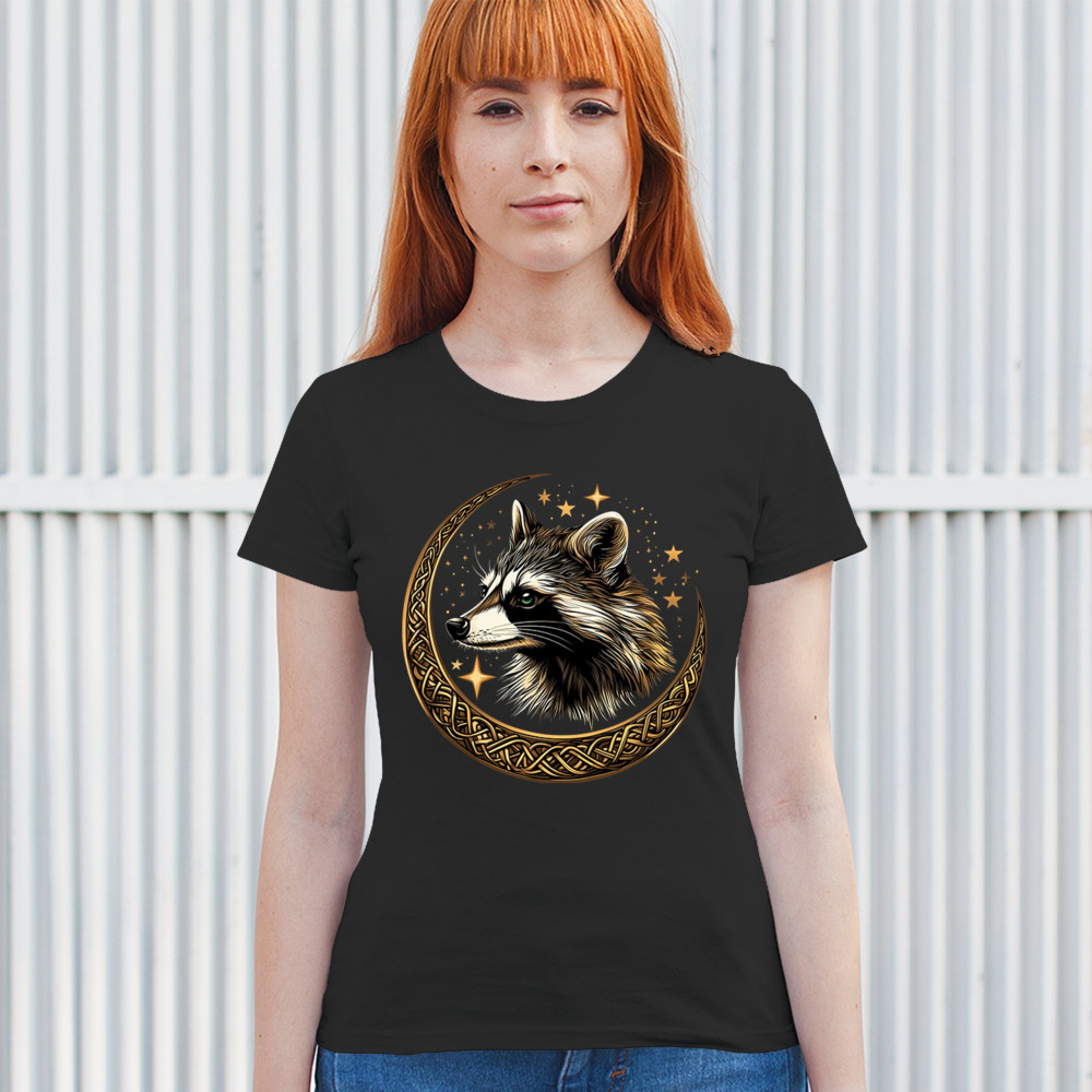 Cosmic raccoon design in Celtic moon. Symbol of adaptability, mystery, and spiritual intelligence. A perfect gift for wild and curious souls.