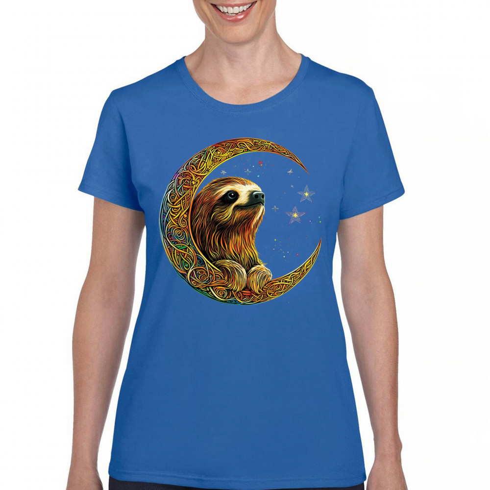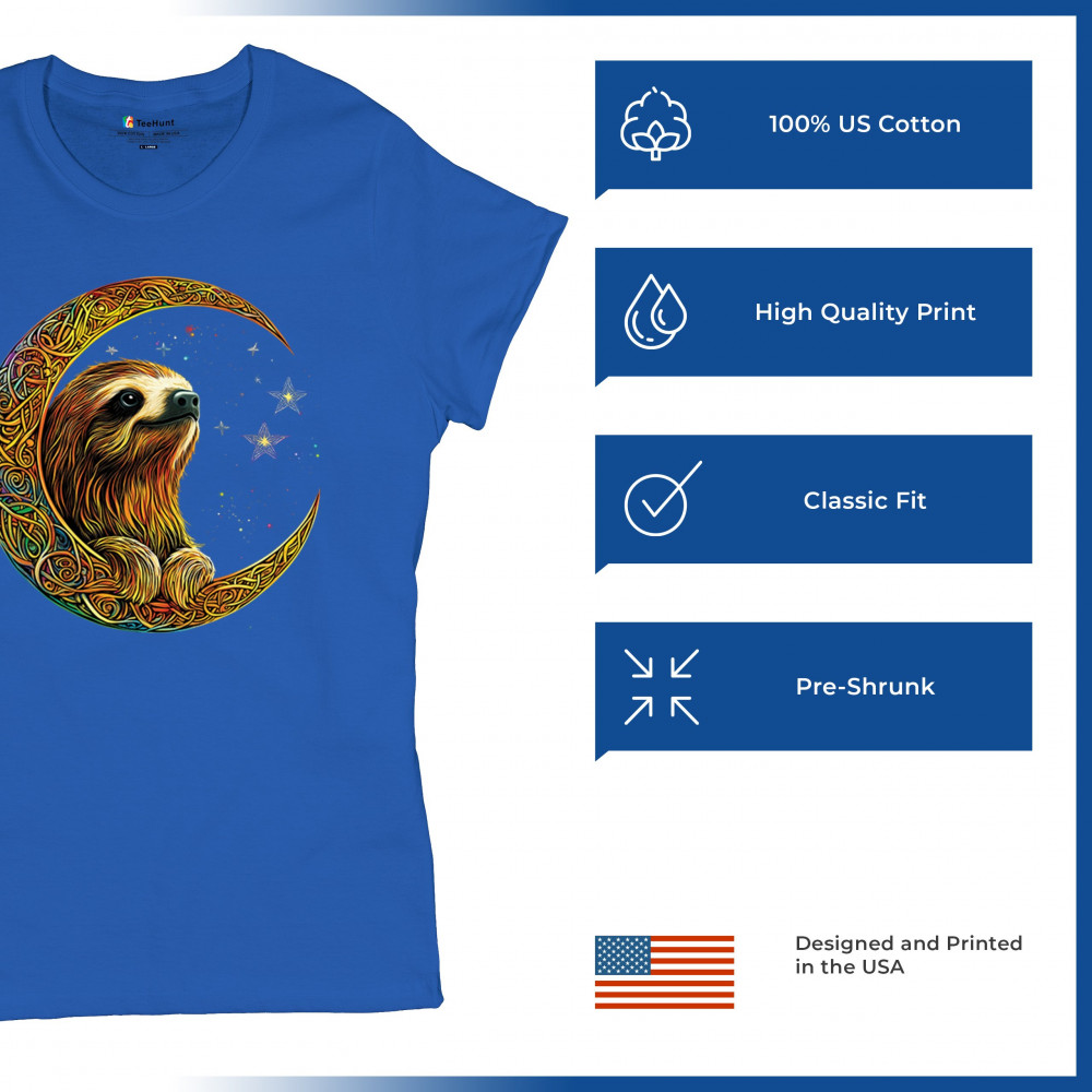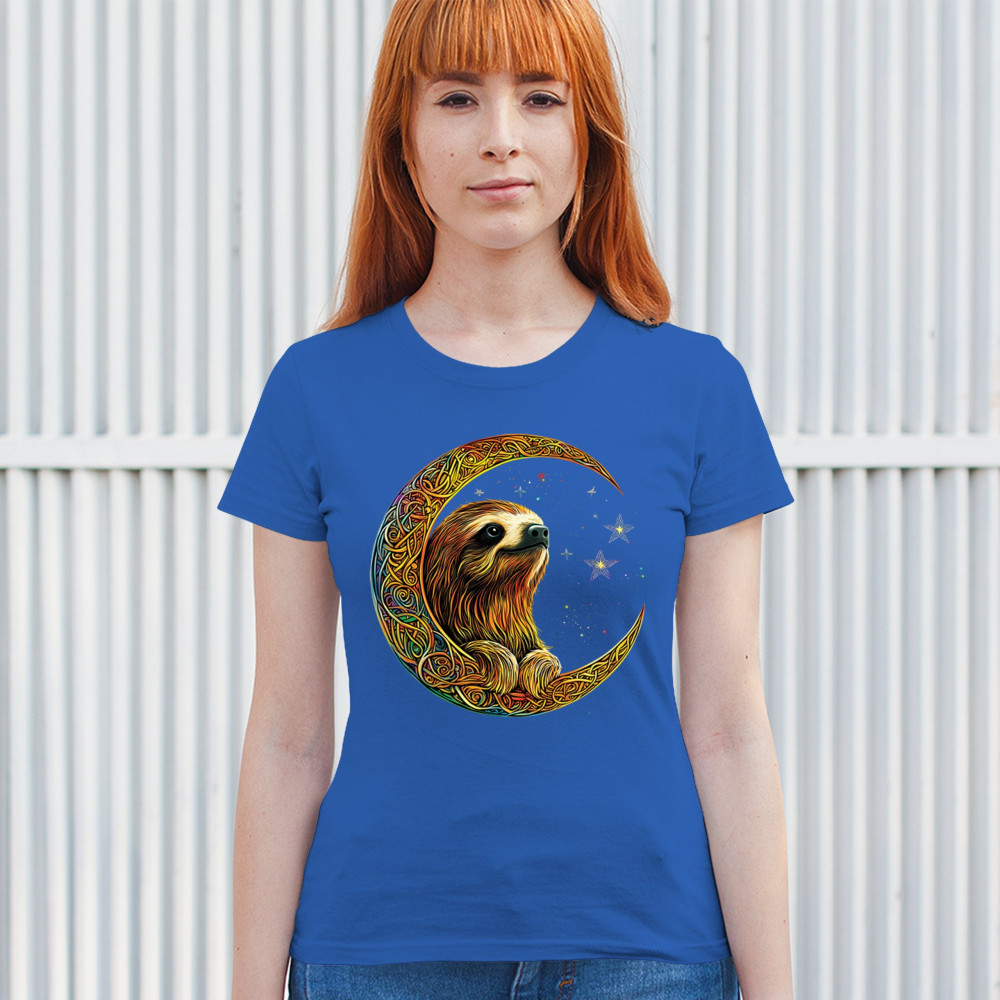Celebrate peace and presence with this stunning sloth design cradled in a gold Celtic crescent moon. Surrounded by a vibrant starry sky, the image blends jungle whimsy with tribal patterns and mystical vibes. A perfect design for lovers of fantasy animals, mindfulness, and slow living. A beautiful tribute to spiritual stillness and cosmic calm.