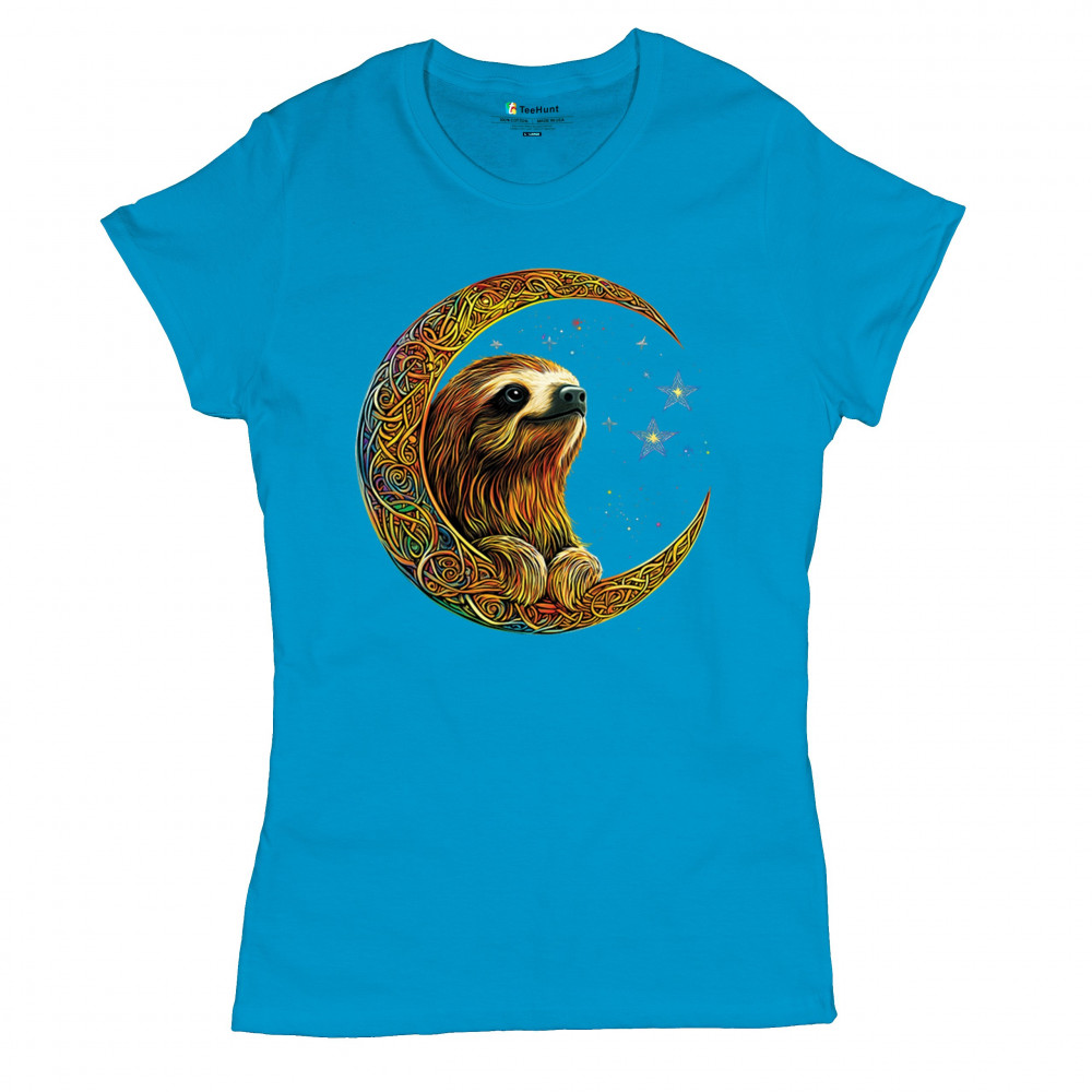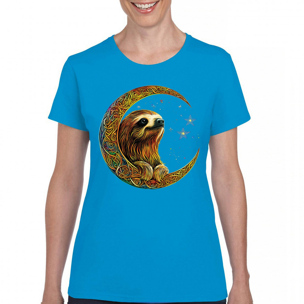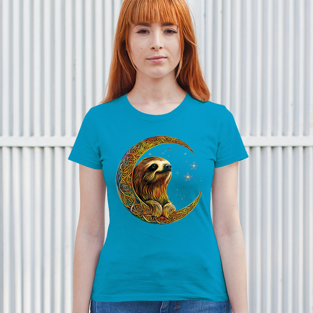 Celebrate peace and presence with this stunning sloth design cradled in a gold Celtic crescent moon. Surrounded by a vibrant starry sky, the image blends jungle whimsy with tribal patterns and mystical vibes. A perfect design for lovers of fantasy animals, mindfulness, and slow living. A beautiful tribute to spiritual stillness and cosmic calm.